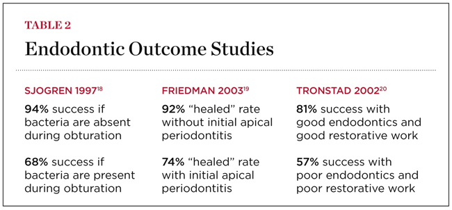 In the final analysis, comparing outcome studies is almost pointless. Putting a blanket success or failure number on all different types of endodontic cases just perpetuates unfounded biases. Gaining an understanding of the differences between variables within the major studies can be more insightful ( Table 2). 18-20