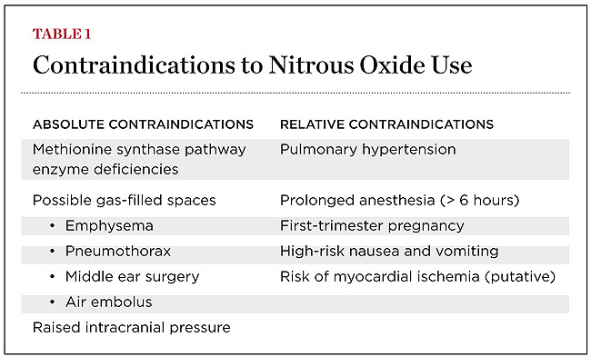The few disadvantages to nitrous oxide include central nervous system depression, nausea, and vomiting; these factors are usually the result of higher concentrations over longer exposure. Absolute and relative contraindications are easily avoided in office-based dentistry with proper screening (Table 1).12