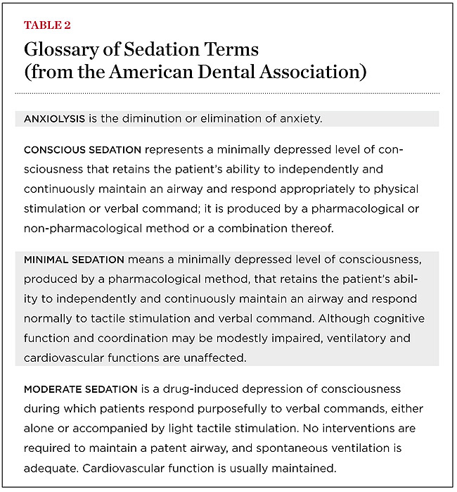 Levels of sedation correspond to the degree of depression of the central nervous system. Older, more traditional terms such as anxiolysis and conscious sedation have been largely replaced by terms more consistent with those used in medical practice, for example, minimal and moderate sedation. The definition of moderate sedation is a depressed state allowing a patient to respond purposefully to verbal stimuli. No interventions are needed to maintain the airway. Spontaneous ventilation is adequate and cardiovascular functions are usually maintained. In deep sedation, the patient may not respond to physical or verbal stimuli, be able to maintain reflex mechanisms, or breathe without assistance. Under general anesthesia, individuals are rendered unconscious, unable to respond to physical or verbal stimuli or breathe on their own (Table 2).
