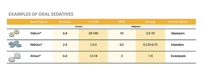 Among the advantages of oral sedatives are their ease of administration, universal acceptance, low cost, decreased number and severity of adverse reactions, and lack of reliance upon syringes or specialized training. Disadvantages include dependence on patient compliance, a prolonged latent period, erratic absorption from the gastrointestinal tract, inability to titrate, prolonged duration of action, and inability to readily lighten or deepen the level of sedation.