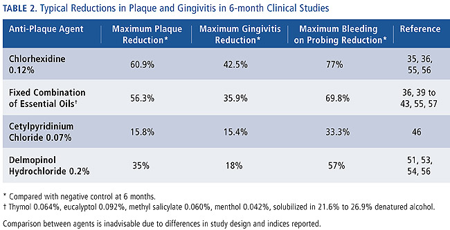 Chlorhexidine has been extensively studied in clinical trials and has been referred to as the gold standard.34 Clinical trials have demonstrated typical reductions in plaque of 21.6% to 60.9% and gingivitis of 18.2% to 42.5%.35,36,55