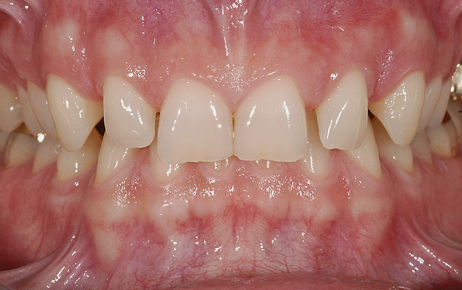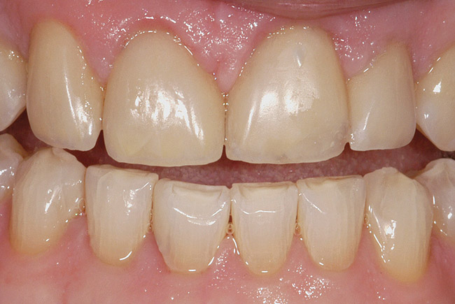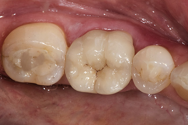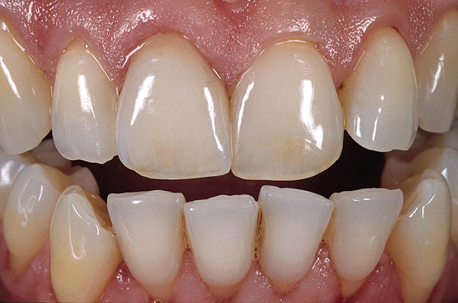 Next is the flexure risk assessment. Each tooth and existing restoration is evaluated for signs of past overt tooth flexure. Signs of excessive tooth flexure can be excessive enamel crazing (Figure 2), tooth and restoration wear, tooth and restoration fracture, microleakage at restoration margins, recession, and abfraction lesions. Often, the etiology is multifactorial and controversial. However, if several of these conditions exist, there is an increased risk of flexure on the restorations that are placed, which may overload weaker materials. Evaluation of this possibility is also based on the amount of remaining tooth structure. The more intact the enamel is, the less potential for flexure. The amount of tooth preparation can directly affect tooth flexure and stress concentration. There is much potential subjectivity in any observational assessment of clinical conditions; however, an assessment of flexure potential for each tooth to be restored is needed. A subjective assignment of Low, Medium, or High Risk for flexure is based on the evaluated parameters, as outlined below. Low Risk: There is low wear, minimal-to-no fractures or lesions in the mouth, and a reasonably healthy oral condition. Medium Risk: Signs of occlusal trauma are present; mild-to-moderate gingival recession exists, along with inflammation; bonding mostly to enamel is still possible; and there are no excessive fractures. High Risk: Occlusal trauma from parafunction is evident, more than 50% dentin exposure exists, there is significant loss of enamel due to wear of 50% or more, and porcelain must be built up more than 2 mm.