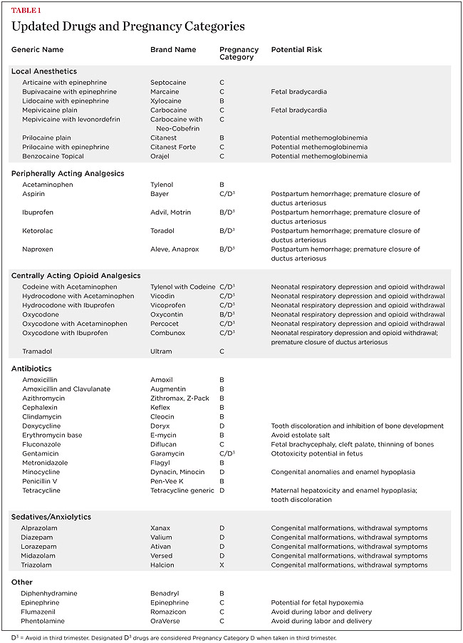 Accurate human risk assessment is impossible to obtain for many newly marketed or infrequently prescribed drugs. Fortunately, the therapeutic agents used in dental practice are used quite frequently, and evidence is available to evaluate their potential risk (view Table 2 online at www.dentalaegis.com/go/id582). In recent years, new agents have come to the market and some changes have occurred to the previous risk classifications. This updated drug listing provides a summary of the current understanding of risk during pregnancy.