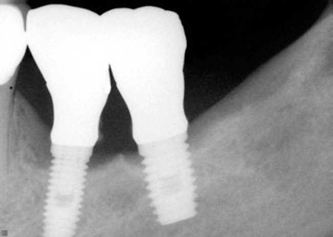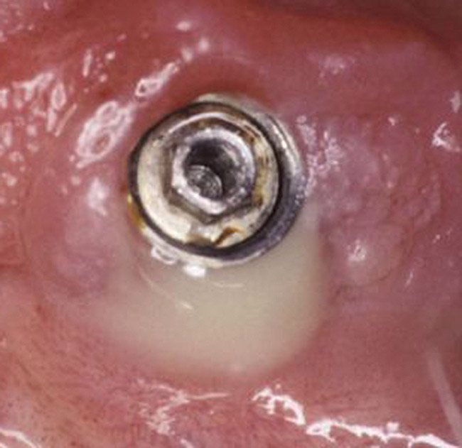 Radiographically, in peri-implantitis, vertical destruction of the crestal bone is present around the implant—which assumes the shape of a saucer—while the bottom part of the implant remains osseointegrated. In some instances, wedge-shaped defects develop along the implant (Figure 1). In addition, there is a peri-implant pocket and bleeding after gentle probing with a blunt instrument, and there may be suppuration from the pocket (Figure 2 and Figure 3). Tissues may or may not be swollen; however, hyperplasia is frequently seen if implants are located in an area with non-keratinized mucosa or if the suprastructure is an overdenture. Pain is not present.9 Both a mean loss of peri-implant bone height amounting to 1 mm to 1.5 mm in the first postsurgical year and vertical bone loss of less than 0.2 mm annually following the implant’s first year of service have been proposed as major criteria for success.18-20 It should be noted that peri-implant bone loss also occurs in cases of overload and faulty occlusion and may be be related to the type of implant used. The implants with the longest smooth surfaces demonstrated the highest amounts of bone resorption 12 months after abutment connection.21 Mobility of an implant suggests complete bone loss and, therefore, complete failure. To prevent this, peri-implant disease should be recognized earlier, to allow intervention before a substantial portion of the supporting bone is lost. However, mobility in early periods of osseointegration is not a very reliable clinical indicator of peri-implantitis. Therefore, electronic measuring devices should be used.
