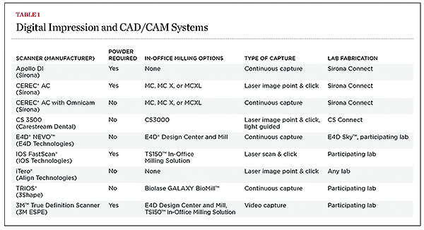 As can be seen by the number of new scanner systems recently brought to market, the field of digital impressions is rapidly growing. Companies such as 3M ESPE and Align Technologies have introduced and subsequently refined their technologies in the past 5 years. 3M ESPE’s newest scanner, the 3M™True Definition Scanner ( www.3mespe.com), has a smaller wand, costs less, and now has open architecture, allowing several CAD software brands to use the file for design. Recently, 3M ESPE announced milling strategies compatible with the E4D® Design Center and Mill ( www.e4d.com) and TS150™ In-Office Milling Solution (IOS Technologies, Inc; www.ios3d.com), enabling clinicians an in-office milling option with a 3M ESPE scanner at a significantly lower cost than competitor in-office milling systems. In the past year, other digital impression scanners such as CS 3500 from Carestream Dental ( www.carestreamdental.com), TRIOS® from 3Shape, and IOS FastScan (IOS Technologies, Inc) have also been introduced. Available digital impression and CAD/CAM systems are listed in Table 1.