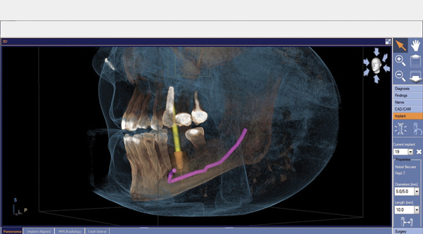 Once the desired restorative outcome is in a digital format, the patient’s CBCT scan is opened in the implant-planning software. If the edentulous space is in the posterior mandible, the inferior alveolar nerve bundle (IANB) is traced so that it is highlighted and avoided by the planned implant (Figure 2). Now, the patient’s digital restoration can be imported. Once imported, most software requires the user to identify corresponding landmarks on the digitized model and on the CBCT to merge the two data sets. It is best to avoid using teeth with crowns or large restorations as landmarks, because they cause distortions in CBCT scans and may result in inaccuracies in data set merges. Once complete, merge accuracy is verified by the user and is either confirmed or reset.