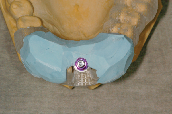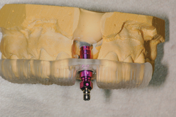 Before the surgical appointment, a provisional restoration can be made if an immediate load situation is anticipated. This is accomplished by retrofitting an implant analog into the patient’s model using the surgical guide. The analog is mounted on a guided implant mount and placed in the surgical guide. The guide is seated on the model after having removed stone to accommodate the analog. Stone is then flowed around the analog and allowed to set (Figure 4). To ensure that the implant ends up in the same position intraorally, an index of the implant mount in the guide on the model is made with polyvinyl siloxane (PVS) bite registration material (Figure 5). Next, a temporary abutment is placed on the analog, and a CAD/CAM crown is designed with a screw-access hole. The crown is bonded to the abutment and the provisional is complete. Alternately, an acrylic crown shell with a hole through it can be adapted over the temporary abutment.