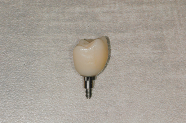 The third and final step in the protocol is delivery of the restoration. Once integration is confirmed, the healing abutment or provisional restoration is removed and the final restoration is tried in. After proximal contacts are adjusted and seating of the restoration is verified radiographically, the occlusion is checked and adjusted. The prosthetic screw is torqued to the manufacturer’s specification, and the screw-access hole is closed by placing a piece of Teflon tape into the hole to protect the screw and filling the hole with composite. Properly done, the access hole is almost imperceptible (Figure 7). The tooth replacement is now complete.
