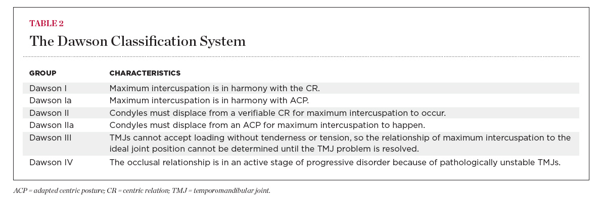 Similar to the Piper Classification System, the Dawson Classification has general categories and subcategories, with a total of six separate groups (Table 2). The first two categories (I and II) describe a joint that is stable enough to relate the occlusion to the joint. Both are subdivided into the primary form of the classification or the subgrouping identified with “a,” depending on whether the patient has an unaltered centric relation (CR) or if he/she has an adapted centric posture (ACP). ACP is the manageably stable relationship of the mandible to the maxilla that is achieved when deformed temporomandibular joints have adapted to a degree that they can comfortably accept firm loading when completely seated at the most superior position against the eminentiae. Dawson groups III and IV describe a jaw joint that is painful to load, or unstable, making a distinction about a patient occlusion uncertain.