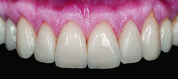 Like all CL-II materials, which have come to be known as glass ceramics, CL-IIa materials can be used for the same indications as CL-I materials—including anterior teeth, bicuspids, and rarely molars. Additionally, they have documented long-term clinical success in higher stress situations or when more dentin is exposed. They may be highly translucent, but traditionally they have required slightly thicker dimensions for workability and esthetics/shade matching (ie, minimum working thickness of 0.8 mm if layered with a veneering porcelain) (Figure 7 and Figure 8).20,21