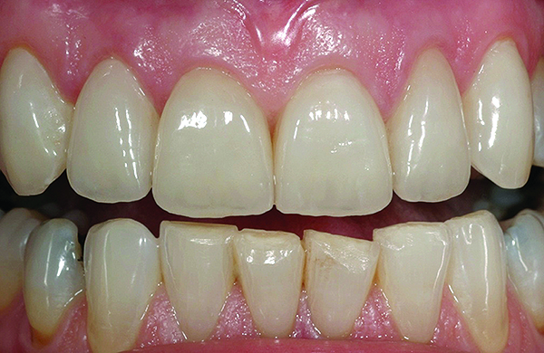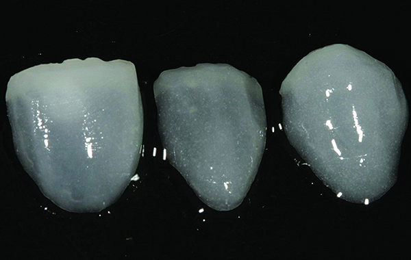 CL-I materials are fabricated by hand (Figure 4); they are the most conservative and generally the most translucent ceramic materials, but they are also the weakest.9,10,18 The material’s high translucency and esthetics create the illusion of natural teeth.9 Powder/liquid porcelain materials are ideal for cases in which significant enamel remains and/or there is healthy tooth structure on the teeth (ie, 50% or more remaining enamel on the tooth, 50% or more of the bonded substrate is enamel, and 70% or more of the margin is in the enamel). Feldspathic porcelain restorations that are bonded to primarily enamel substrates have proven to be highly successful long term.19