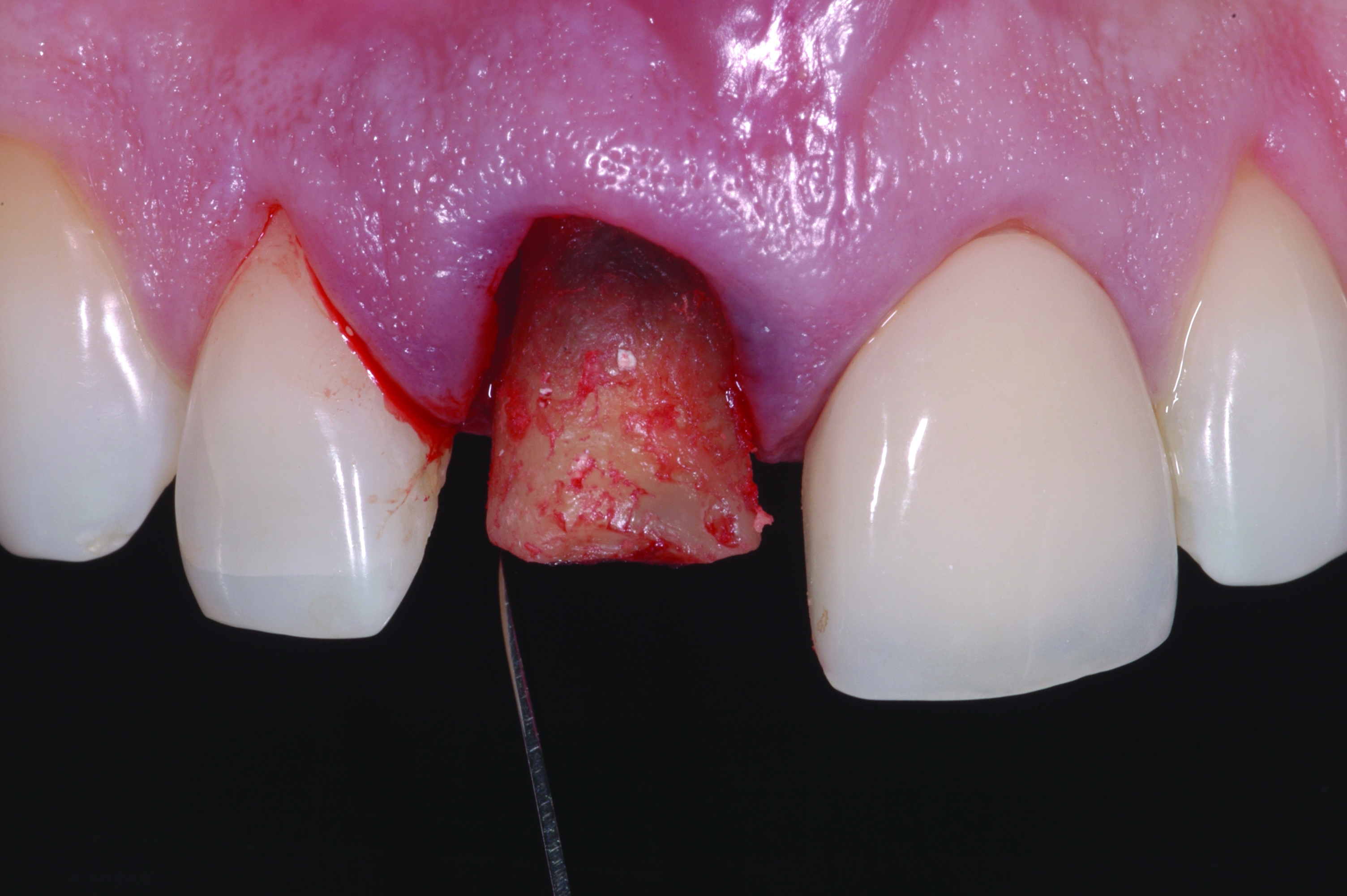 Since immediate implant placement and provisionalization is recommended only in intact sockets, it is essential that alveolar bone and gingiva be preserved with an atraumatic extraction technique. Instruments such as periotomes, small elevators, and root forceps may be used to avoid damage to the labial plate. Following extraction, the site must be thoroughly inspected to verify the integrity of the osseous crest (Figure 1).
