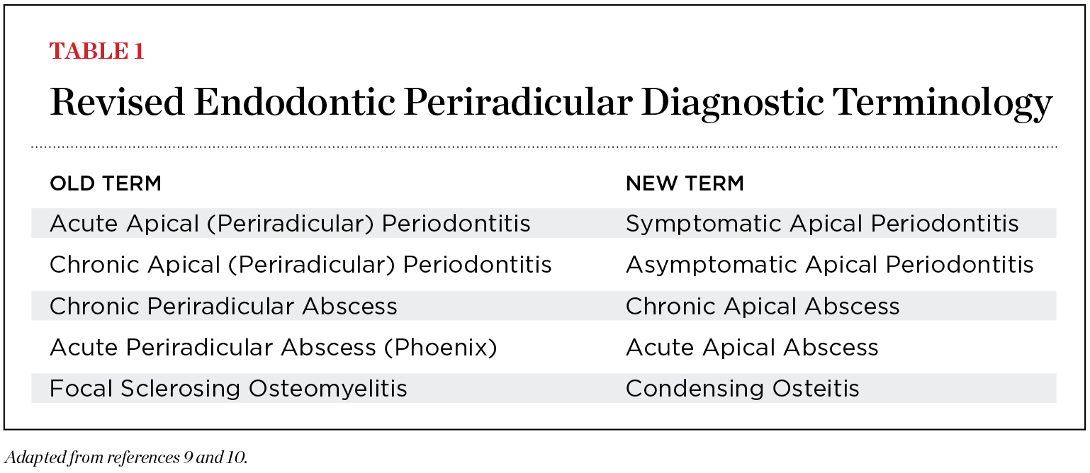 When clinicians think of endodontic treatment, they often focus only on the pulpal diagnosis. Although this diagnosis is important prior to performing root canal treatment, making a periradicular diagnosis is just as important. As with the changes in pulpal diagnosis, in 2013, the endodontic periradicular diagnostic terminology adopted by the AAE in 20099 was incorporated into the National Board Dental Examination, Part II, by the JCNDE (Table 1).