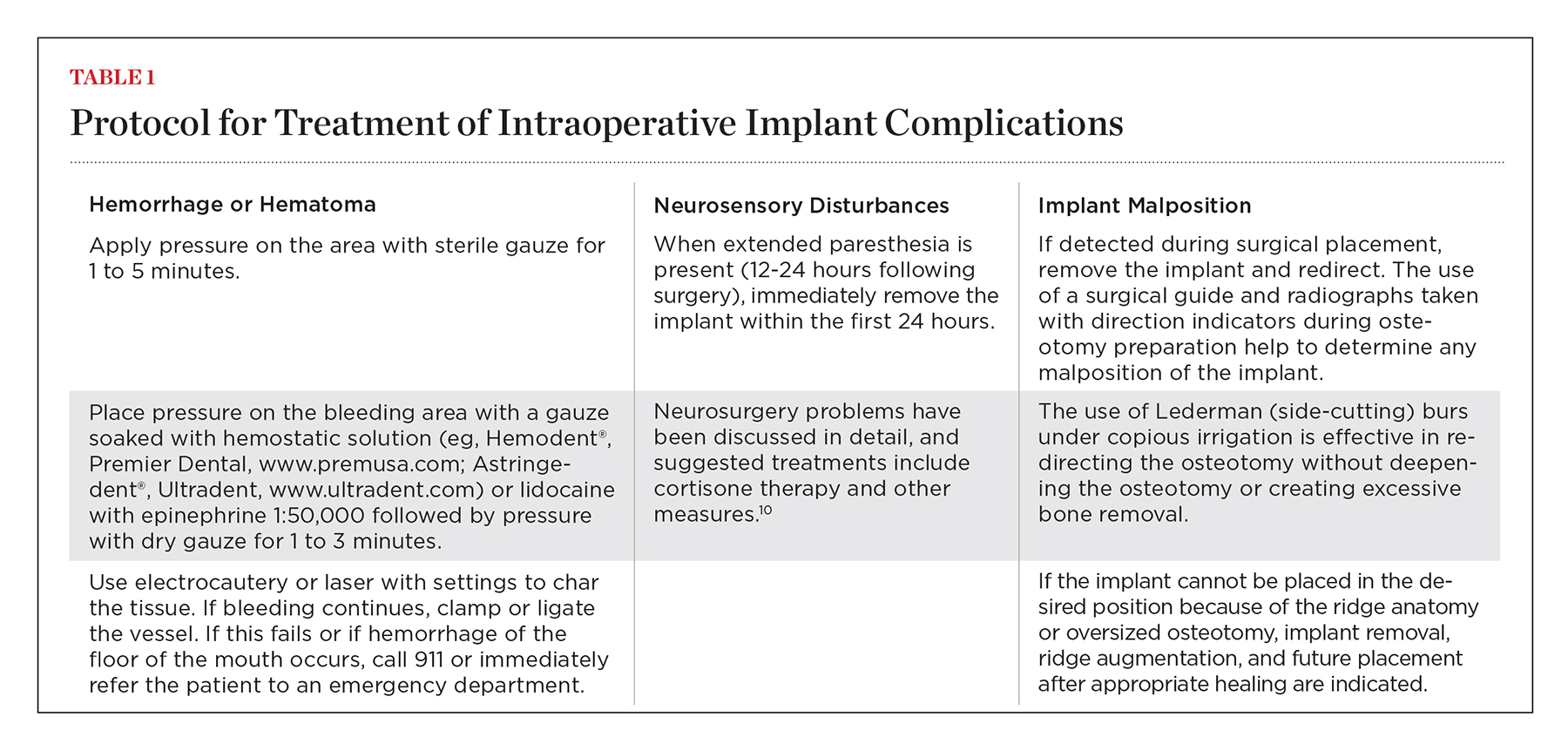 Suggested treatment for hemorrhage or hematoma, neurosensory disturbances, and implant malposition encountered during surgery is outlined in Table 110.