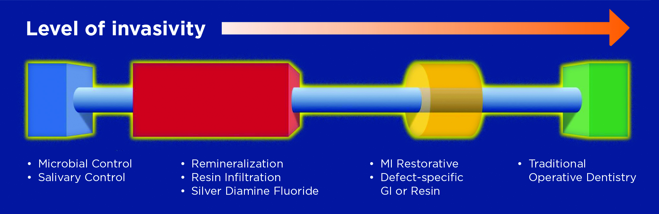 In thinking about the management of dental caries in various phases, one could consider a caries management continuum (Figure 1). In this continuum, the left side reflects the least invasive forms of caries management used prior to the use of surgical restorative interventions. Moving from left to right, interventions progress from salivary and preventive protocols that mitigate risk to minimally invasive restorative dentistry to the latest phases of treatment in the form of traditional operative dentistry. Superimposed on this continuum is the “level of invasivity,” or how aggressive the treatment is in terms of irreversibility. Microbial control, salivary control, remineralization, and resin infiltration are reflective of various treatments one could employ while avoiding surgical intervention. Given the ever-increasing availability of early caries detection tools, and more specific caries risk assessment tools, it will become increasingly possible to deploy nonsurgical approaches in the form of medicinal therapeutic interventions and avoid surgical restorative intervention.