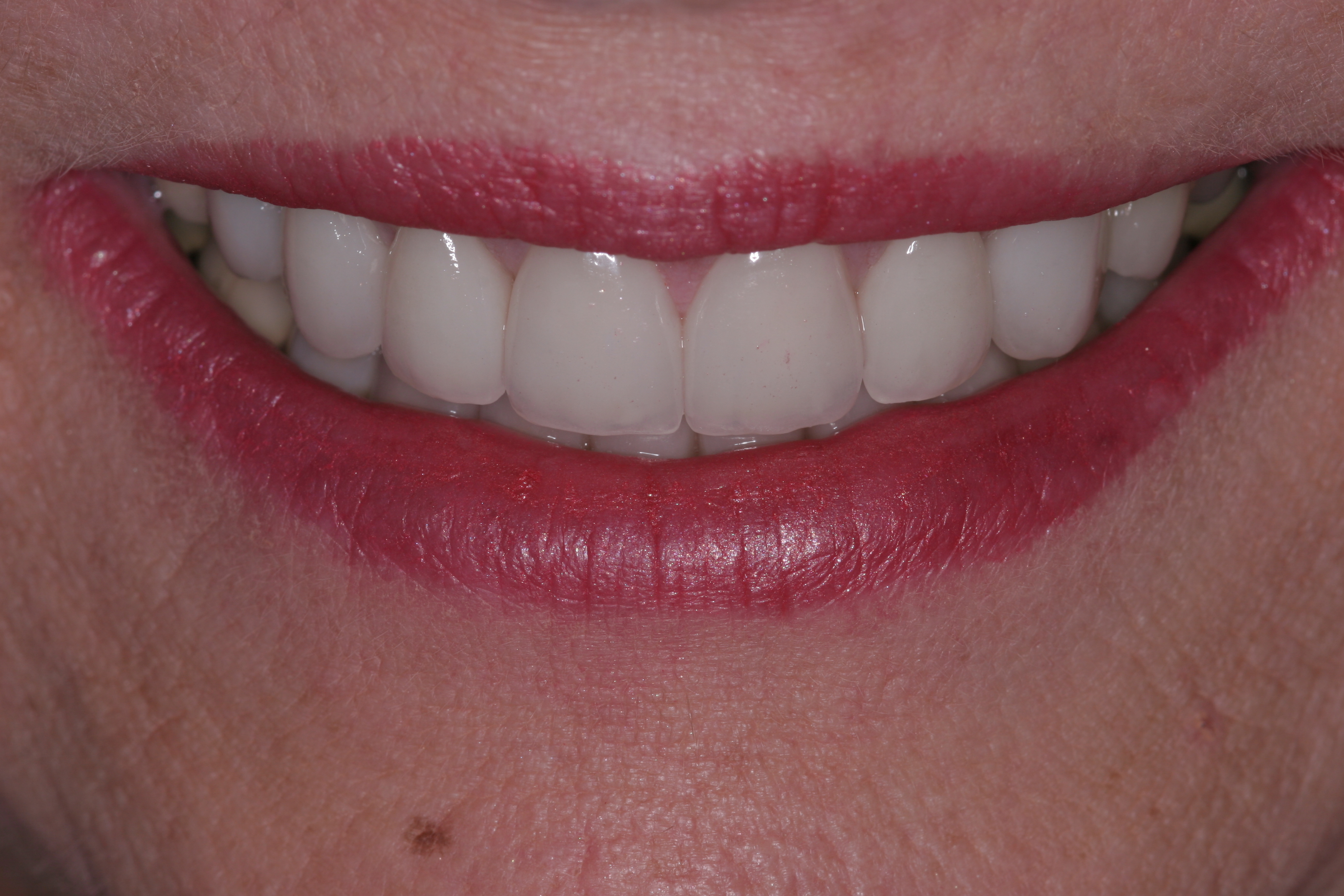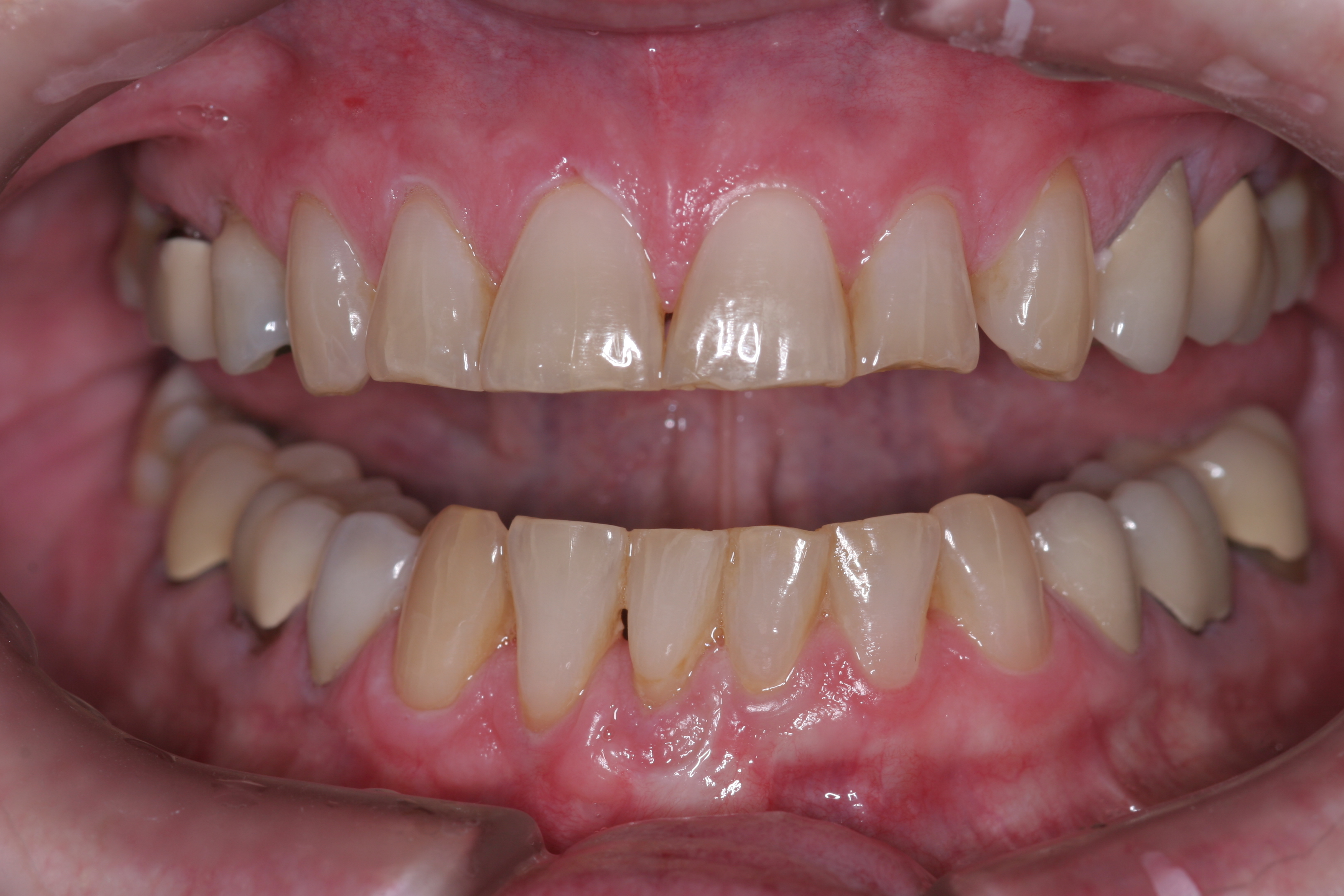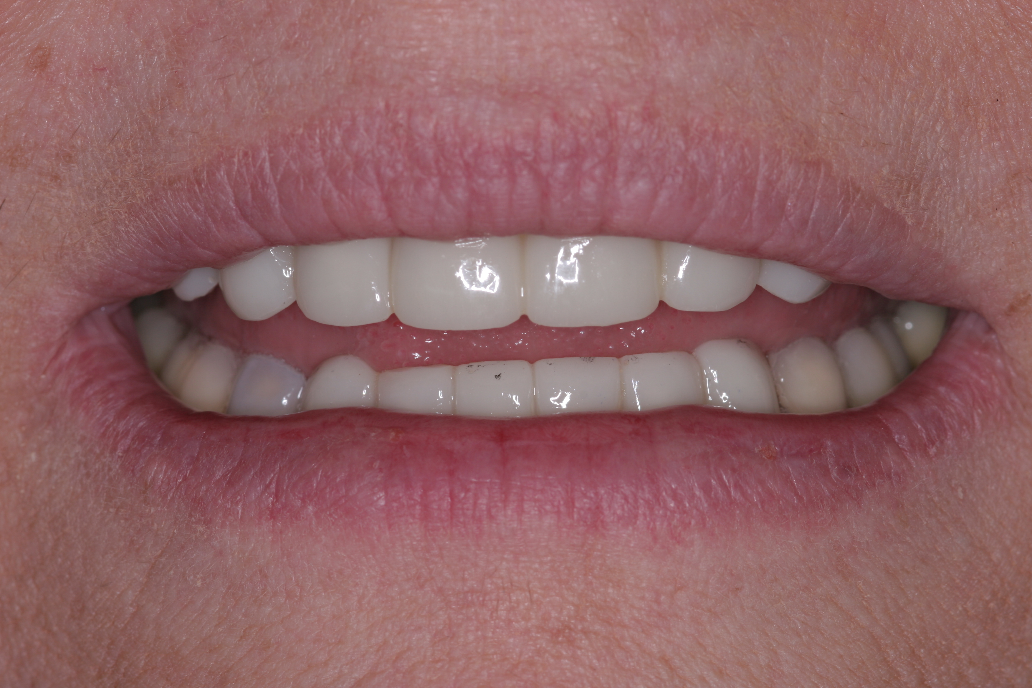 A patient presented with advanced generalized wear of her anterior teeth (Figure 10 and Figure 11). She was displeased with their overall appearance because of their color and wear (Figure 12). A complete examination was performed, revealing instability in her temporomandibular lateral poles bilaterally, sore muscles of mastication, advanced wear, a CR/MIP discrepancy, and loss of her anterior guidance due to the wear. Although the topic is beyond the scope of this article, the patient was also screened for possible sleep apnea. This included an evaluation of the Mallampati score, previous sleep therapy evaluation or treatment, snoring history, an evaluation of her neck size, her weight status, and the presence of the tonsils and their size. In every case, if this clinician suspects airway obstruction to be playing a role in tooth wear issues, the patient is referred to a sleep physician. The patient in this case displayed few apnea risk factors, and the patient’s anterior wear facets fit together like a “lock and key” pattern seen in parafunctional activity. Splint therapy was initiated to stabilize the joints and muscles. A repeatable CR position was verified through load testing. At this point diagnostic models, photographs, a CR bite record, and a facebow were taken and recorded.