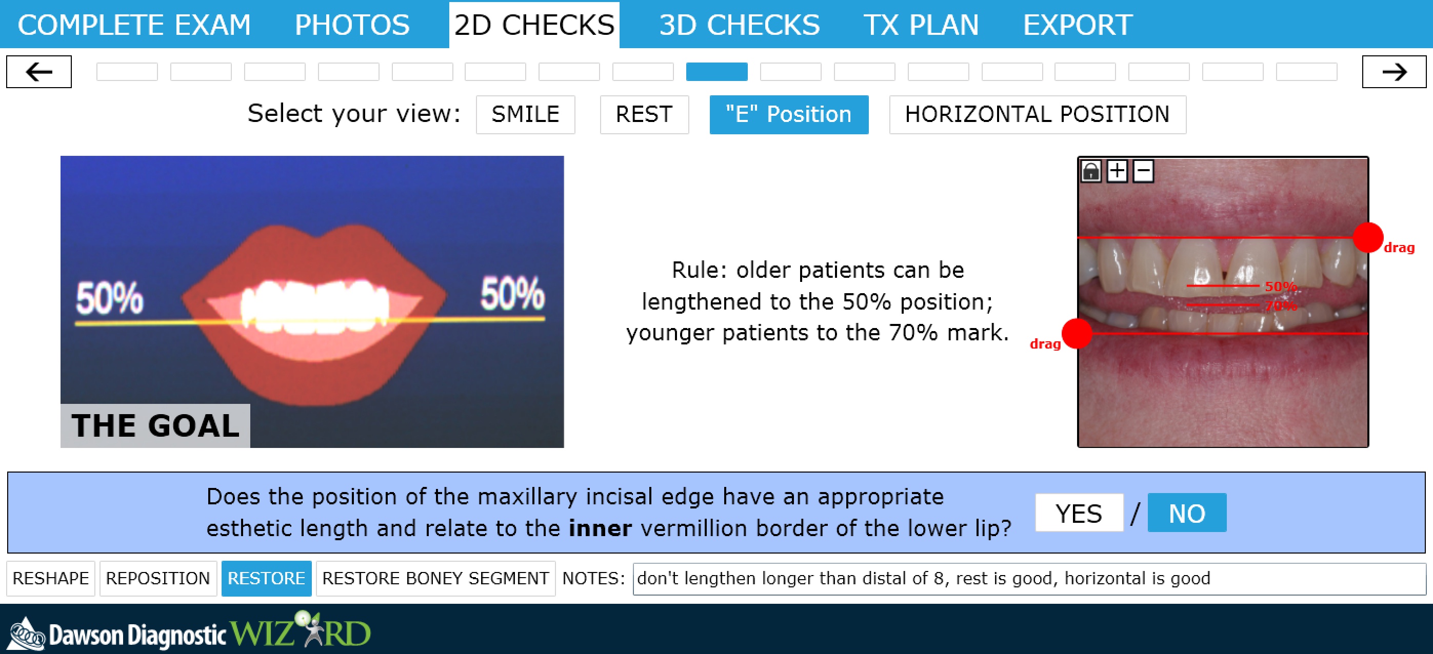 The “e” position is another useful reference when determining central incisor length. This position is created by the patient pronouncing a long “e” sound, and the relative position of the lips to the incisal edge is evaluated. Ideally, the incisal edge will be between 50% and 70% of the distance between the upper and lower lips.