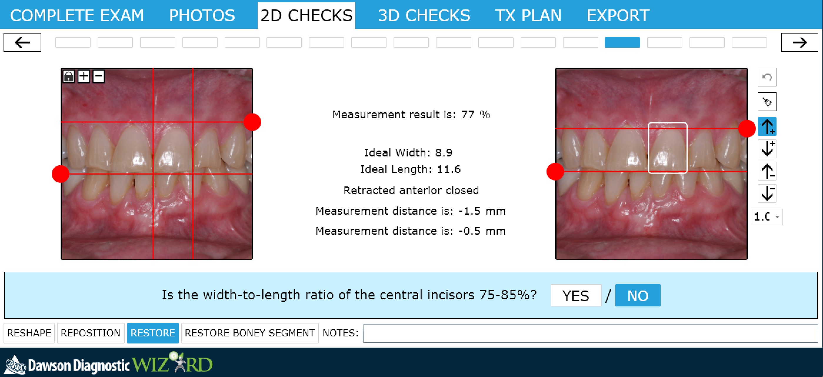 With the degree of wear and instability present, it was critical to place the incisal edges in their correct position for function and esthetics. The patient’s rest position photograph showed nearly the correct amount of tooth display (Figure 13), and the “e” position photograph showed the edge to be at the 60% mark (Figure 14). This meant that very little or about 0.5 mm of tooth length could be added to the incisal edges to gain length. Any additional length would need to come from the gingiva through crown lengthening. The horizontal position was determined to be acceptable based on the tip-down and 90º smile photographs (Figure 15). Figure 16 shows that 1.5 mm of crown lengthening would be necessary to achieve a desirable width/length ratio.