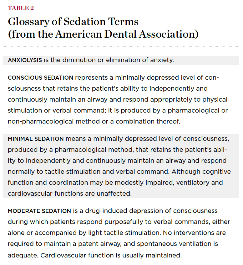 Levels of sedation correspond to the degree of depression of the central nervous system. Older, more traditional terms such as anxiolysis and conscious sedation have been largely replaced by terms more consistent with those used in medical practice, for example, minimal and moderate sedation. The definition of moderate sedation is a depressed state allowing a patient to respond purposefully to verbal stimuli. No interventions are needed to maintain the airway. Spontaneous ventilation is adequate and cardiovascular functions are usually maintained. In deep sedation, the patient may not respond to physical or verbal stimuli, be able to maintain reflex mechanisms, or breathe without assistance. Under general anesthesia, individuals are rendered unconscious, unable to respond to physical or verbal stimuli or breathe on their own (Table 2).