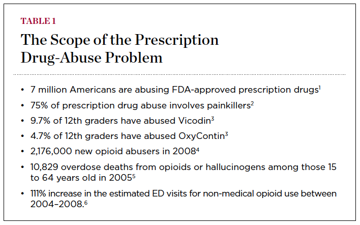 The Drug Enforcement Administration reports that approximately seven million Americans are currently abusing prescription drugs that are approved by the Food and Drug Administration (FDA) (Table 1).1 This exceeds the combined number of people who are abusing cocaine, heroin, hallucinogens, and ecstasy.1 Subsequently, increased attention recently has been given to the growing epidemic of prescription drug abuse as people throughout the nation, including high-profile celebrities and multitudes of suburban children, die of overdoses.