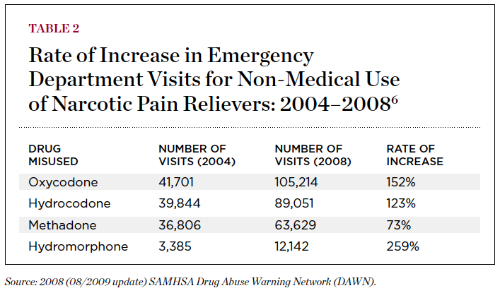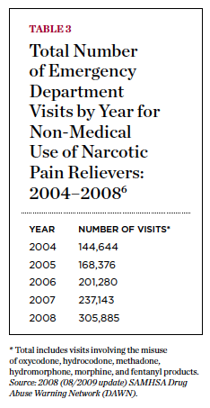 The Centers for Disease Control and Prevention (CDC) reports that the number of accidental overdose deaths from opioids or hallucinogens among those 15 to 64 years old increased 83% from 5,921 in 1999 to 10,829 in 2005, and non-fatal unintentional poisonings for those 15 to 64 rose 44% from 376,611 incidents in 2001 to 542,372 in 2007.5 These trends are driven primarily by the growing abuse of opioids.5 Recently, the Substance Abuse and Mental Health Services Administration's (SAMHSA) Drug Abuse Warning Network (DAWN) system examined emergency department (ED) visits for non-medical use of prescription drugs (Table 2 and Table 3).6 Researchers reported that from 2004–2008 the estimated number of ED visits for non-medical use of opioid analgesics increased 111%, from 144,600 to 305,900 visits, and increased 29% during 2007–2008 alone. The highest numbers of ED visits were recorded for oxycodone, hydrocodone, and methadone. During the 5-year period studied, misuse of oxycodone (eg, OxyContin, Percocet) rose 152% to more than 105,000 ED visits. For products containing hydrocodone (eg, Vicodin, Lortab) ED visits rose 123%, to more than 89,000. Moreover, for the heroin-substitute methadone, ED visits rose 73%, to close to 64,000, and ED visits for hydromorphone (eg, Dilaudid) increased by 259%.6