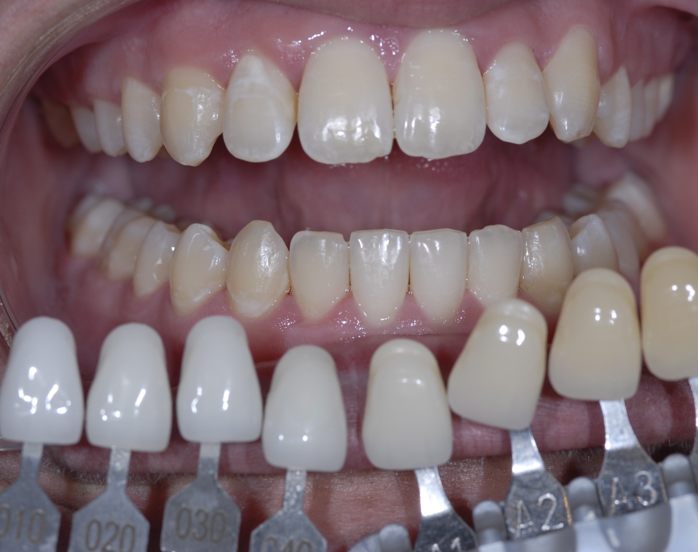 When discussing the results with the patient, using specifically scripted language helps to convey that the treatment was successful, dramatically improving their appearance. First, the doctor should ask a team member, “What shade of yellow was the beginning shade?” followed by “What shade are the teeth now?” The team member should answer with an enthusiastic response, such as, “Doctor, they have whitened all the way to the 010 whitening shade tab!”