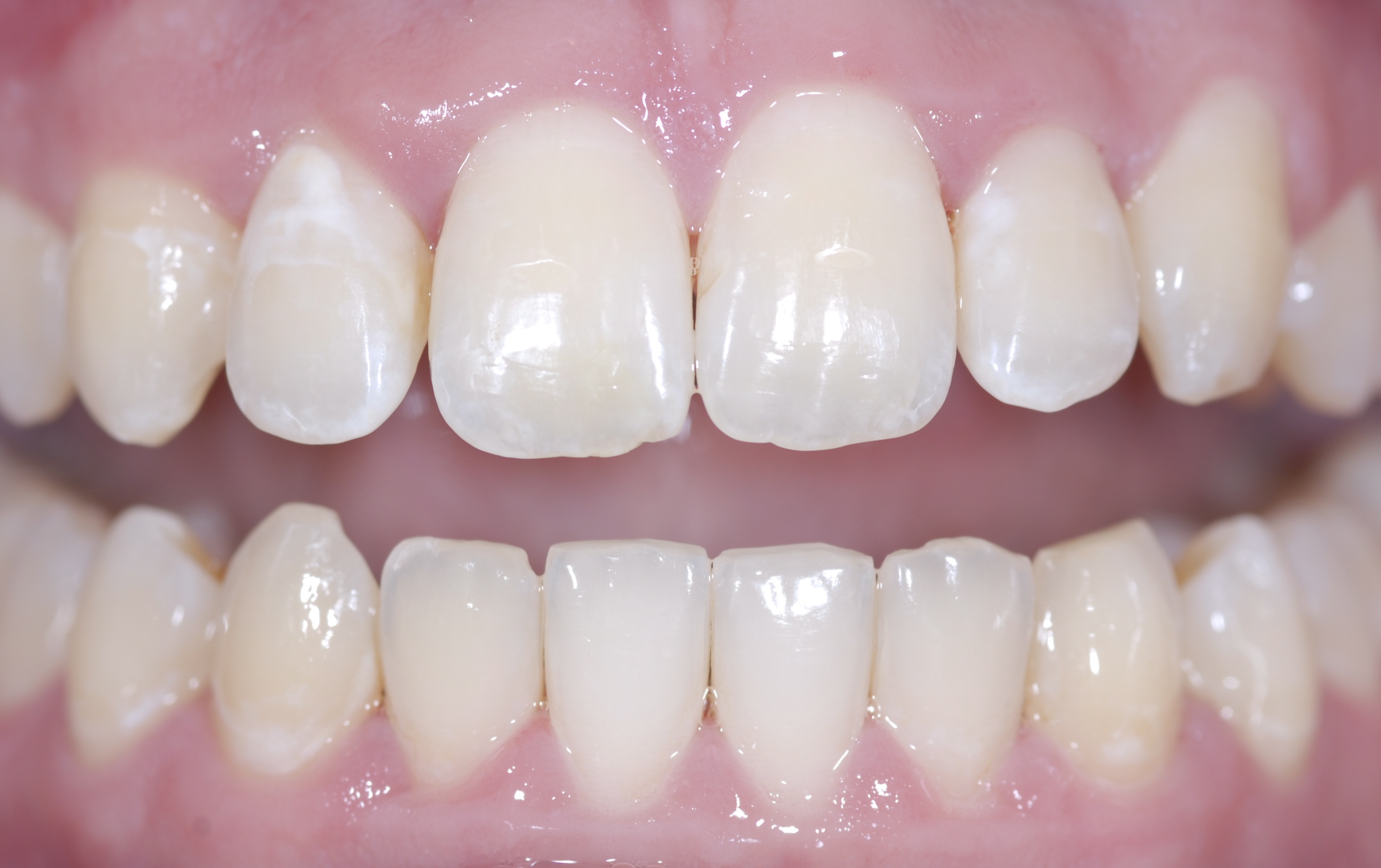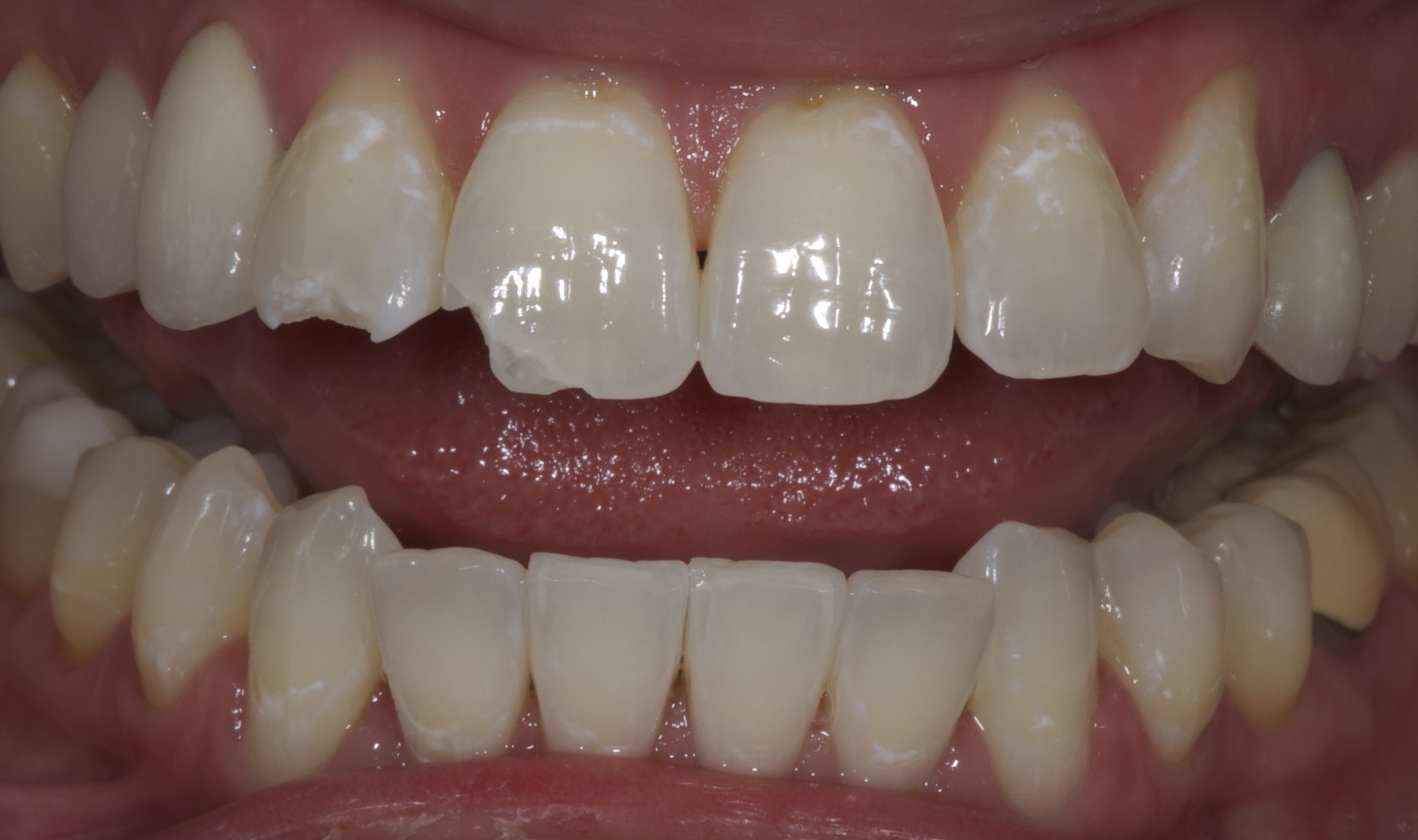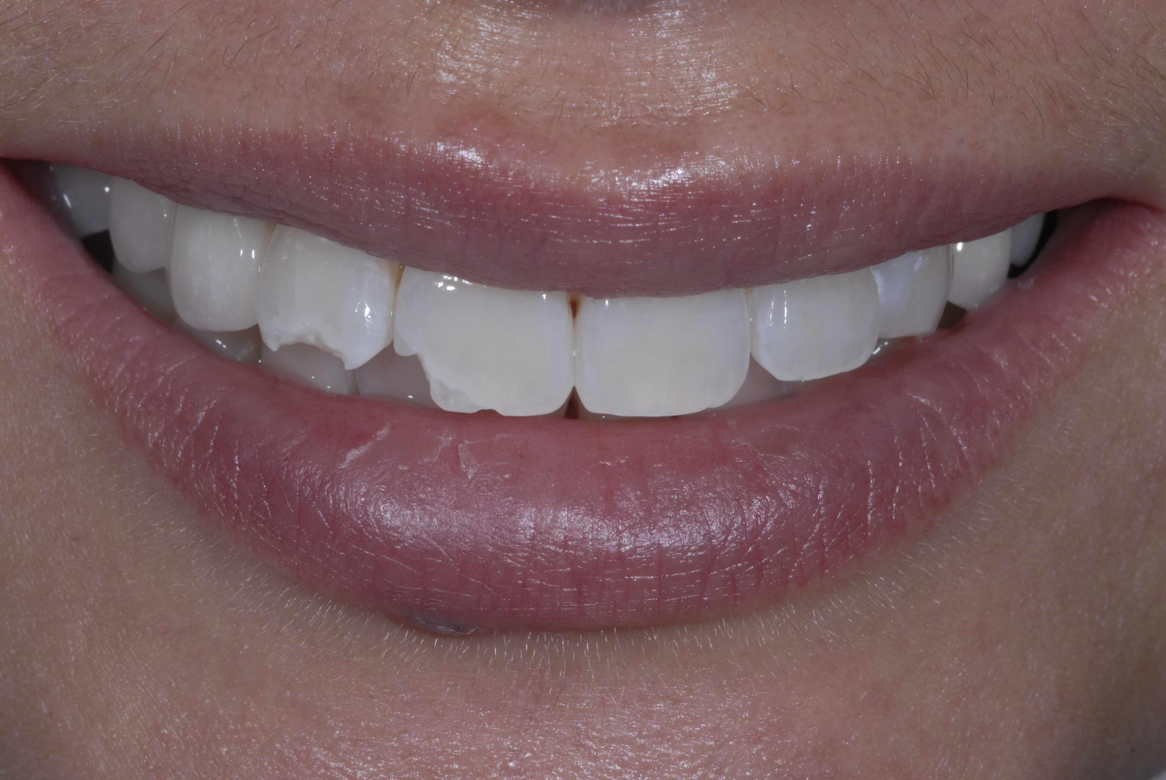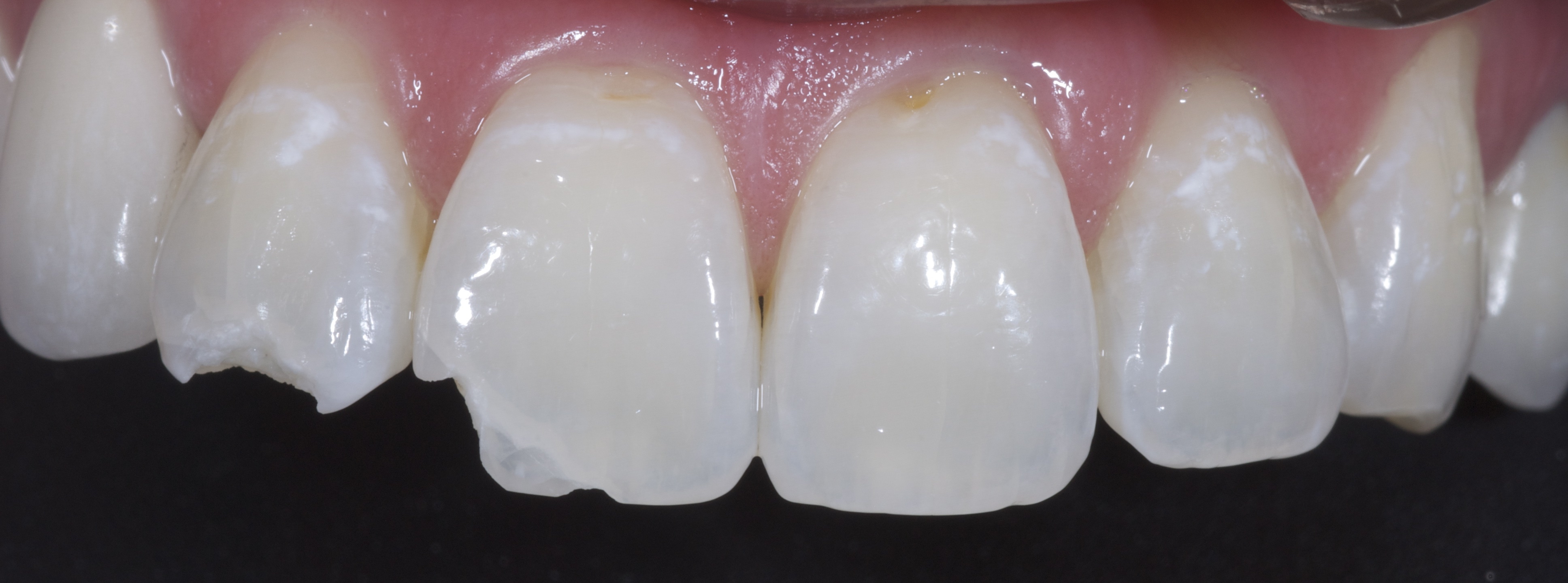 A 30-year-old female patient presented with right lateral and central incisors that were fractured in a fall (Figure 7). Radiographs were taken, and clinical testing revealed a fracture-free root and a vital pulp. The patient was presented with restorative options including porcelain and composite restorations. She chose direct composite restorations based on her desire to conserve tooth structure. After reviewing photographs of previous patients, the whitening discussion was undertaken. The patient expressed that she preferred the quickest solution to attain the whitest smile possible, so in-office power bleaching was chosen.