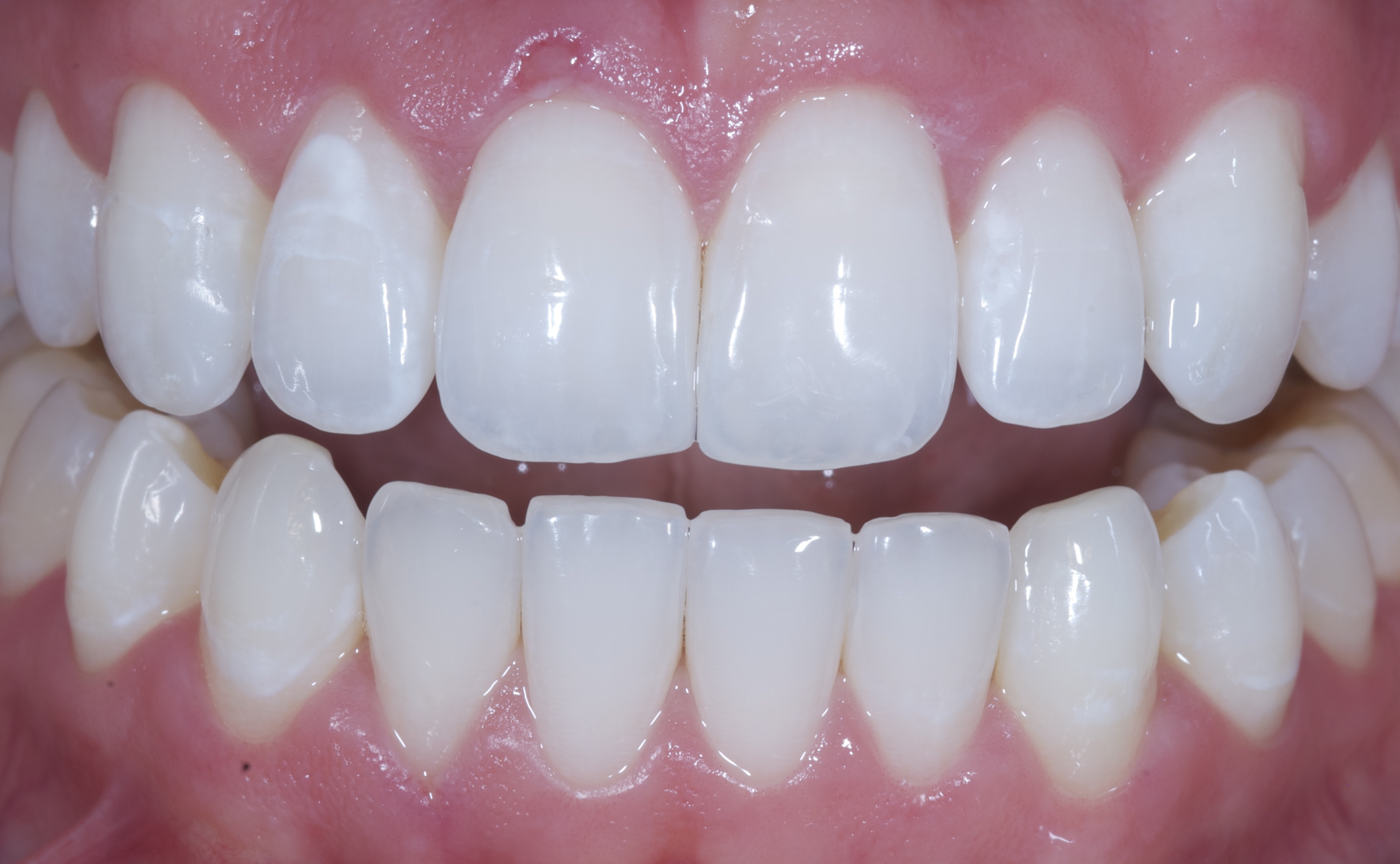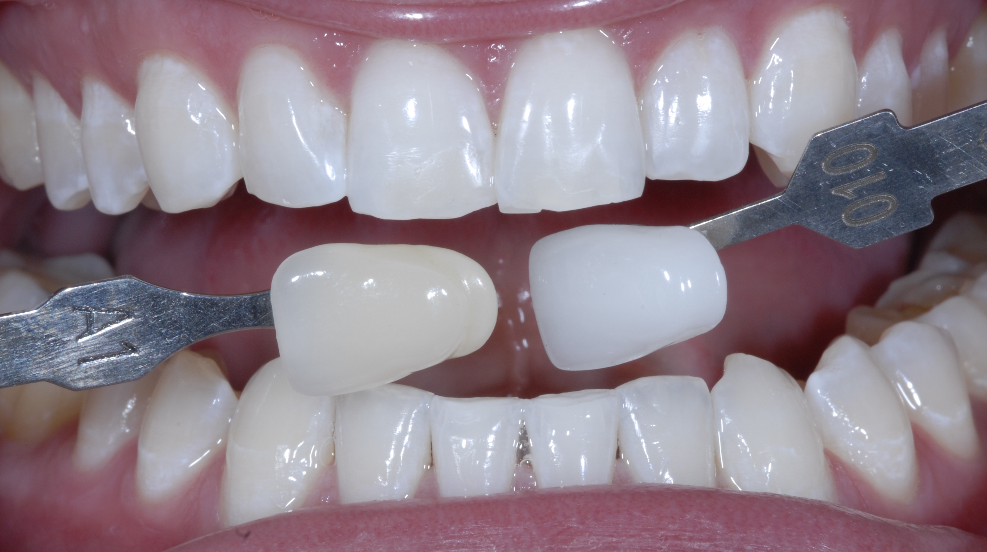 When the procedure is complete, either in-office or at-home, team members should follow a checklist for the postoperative evaluation. A final postoperative photograph is taken with the original single shade tab that matched the preexisting darker color placed on the left half of the photograph (ie, the patients right side) and the new single shade tab that matches the whitened teeth placed on the right half of the photograph (ie, the patient’s left side) (Figure 6).