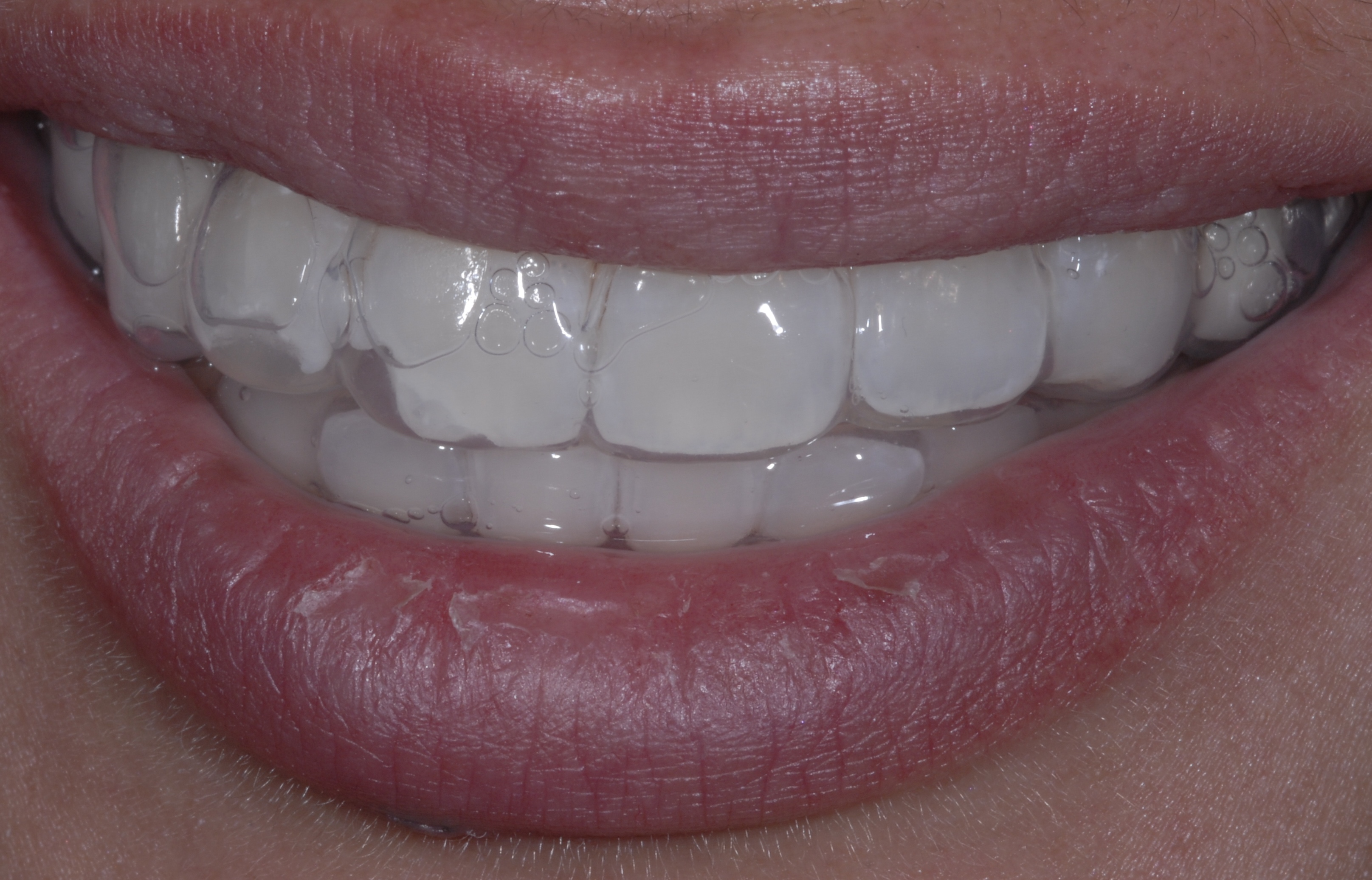 A 25% hydrogen peroxide bleaching gel (Philips Zoom WhiteSpeed) was applied three times in 15-minute cycles, for a total exposure time of 45 minutes. The patient was given at-home trays filled with desensitizing gel (Relief ACP Zoom), which also contains remineralization agents to increase the microhardness of the enamel (Figure 8).7
