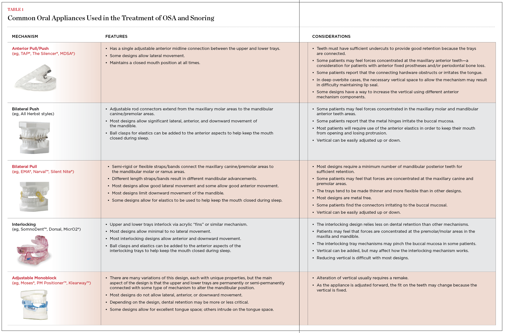 With more than 100 custom fabricated oral appliances available on the market, as well as a host of non-custom appliances, oral appliance selection can be confusing and overwhelming for many dentists. All oral appliances used in the treatment of OSA and snoring attempt to achieve the same effect: the maintenance of a patent oropharyngeal airway through the stabilization of the mandible and associated soft tissue or by holding the mandible in a forward position. How each appliance accomplishes this is the difference. Oral appliances used in the treatment of OSA and snoring are categorized by the mechanical action that the appliance employs to help prevent the mandible from moving posteriorly and/or actively hold the mandible anteriorly (Table 1).