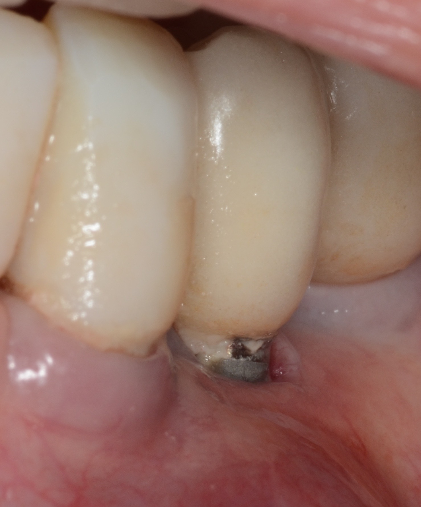 The presence of excess subgingival cement also has been implicated in the development of peri-implantitis (Figure 4).13 To reduce this risk, a crown margin should be cemented at the gingival margin to allow for cement visualization and easy cleanup. In addition, the use of a radiopaque cement is recommended, and an x-ray image should be taken to ensure that no cement is left behind. The use of screw-retained restorations, when possible, is recommended over cement-retained ones to help avoid this problem.
