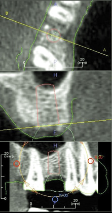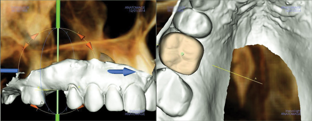 Due to the need for medical treatment for shoulder and neck issues, the patient was delayed in returning to the office for subsequent evaluation. At the 7-month postoperative appointment, the socket was assessed and a panoramic radiograph was taken to evaluate the bone at the planned implant site (Figure 1). The socket was filled with bone that was indistinguishable from the patient's native bone adjacent to the site. Insufficient height to place an implant was noted, which would require a crestal sinus lift prior to implant placement. A cone-beam computed tomography (CBCT) scan was ordered for planning purposes. Planning software was used to properly position a 5.2 x 10 mm implant for placement into the edentulous site, confirming that some elevation of the sinus would be required (Figure 2 and Figure 3). This data was used to order a surgical stent to guide implant placement (Figure 4).