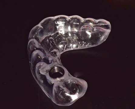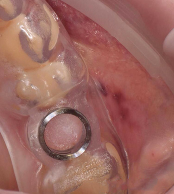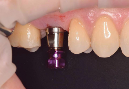 To fabricate a soft-tissue model, the lab placed an analog onto the fixture mount and reinserted it into the impression. A scan head was then inserted into the analog in the soft-tissue model to create a virtual model. In the planning software, a titanium base was placed into the virtual analog and a crown was designed to fit the base and the anatomical parameters of the available space. Following design, the full-contour zirconia crown was milled and polished. The finished monolithic zirconia crown was then luted to a titanium base insert with a self-adhesive resin cement, and upon seating, the excess cement was removed and the margin between the base and the zirconia was polished.