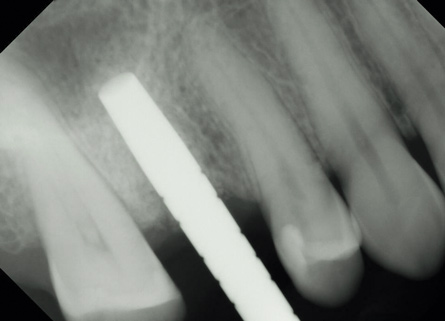 After the restoration was returned from the lab and steam sterilized, the healing abutment was removed, the crown was tried in, and a periapical radiograph was taken to verify seating. With the seating verified, the crown's fixation screw was tightened with a torque wrench, and the access hole was sealed with composite. A final check revealed the presence of a functional occlusion.