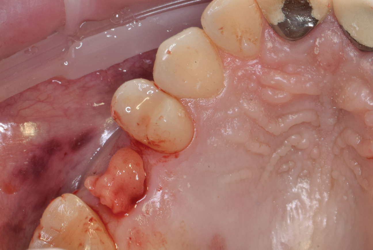 The prepared extraction socket was filled with the graft mixture and covered with a resorbable collagen membrane. A figure eight suture using a 6-0 polypropylene blue monofilament was placed to retain the membrane and socket graft during the initial days of healing. When the patient returned a week later and the suture was removed, the site demonstrated minimal inflammation and partial closure of the gingiva was observed.