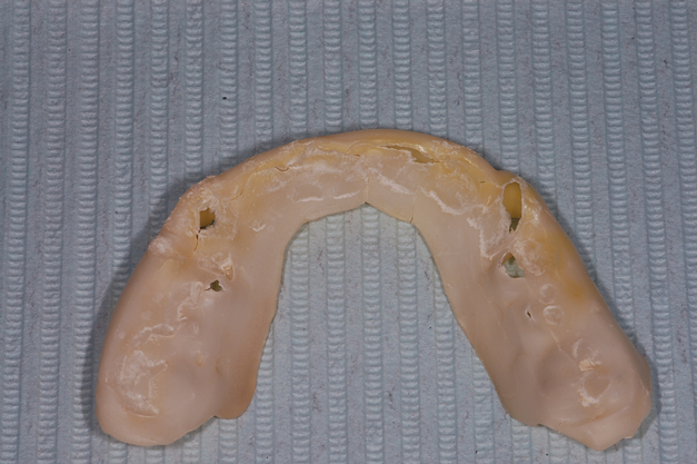 Because this tray is harder than some one-piece clear thermoplastic trays, it is a good option for bleaching patients who are bruxers. It can also be used to help diagnose currently bruxing patients. After 1 to 2 weeks of wearing the tray, the presence of wear marks or holes will indicate whether or not a patient is currently bruxing (Figure 4). Some patients are aware of their nocturnal bruxism but are hesitant to invest in the needed hard occlusal splint for protection because they are concerned about their nighttime comfort. The chairside fabrication of this tray can allow them to test that concern. If they can sleep comfortably wearing this tray, then they should be able to sleep comfortably wearing a bruxism splint.
