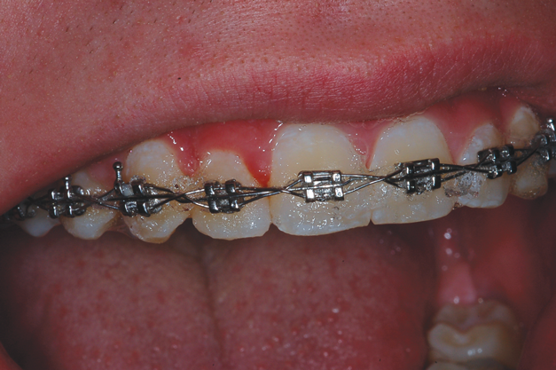 For bleaching treatment, the carbamide peroxide is injected into the tray via the trough created by the arch wires and brackets, and then the tray is inserted into the mouth. Typically, more bleaching material is used with this treatment in order to fully penetrate the wires and brackets to mechanically and chemically clean the braces (Figure 10). It is recommended that patients wear the tray while sleeping because of the reduction in saliva flow that happens nocturnally. A new tray will need to be made about every 3 to 4 months due to the shifting of the teeth, but this soft tray will not impede the progress of the orthodontics. The tray is difficult to fabricate on the mandibular arch because it requires good tongue control by the patient to be successful. Although a conventional alginate impression could be made, it would require removing the arch wires each time, and it would not capture the gingiva as well as a tray made directly in the mouth.