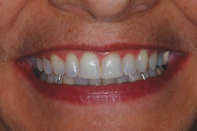 This tray is ideal for bleaching and the application of desensitizing agents. Because it is clear, it can be worn in public without much visibility. To treat tooth sensitivity, the clear thin thermoplastic tray is used in conjunction with 5% potassium nitrate.8 Sensitivity during bleaching is caused by the easy passage of peroxide through the intact enamel and dentin to the pulp in 5 to 15 minutes,9 leading to a reversable pulpitis. Potassium nitrate travels through the intact enamel and dentin to the pulp in approximately 30 minutes10 and does not allow the nerve to repolarize after it has depolarized in the pain cycle, relieving pain in more than 90% of patients.8 In effect, the potassium nitrate "numbs" the nerve much like a topical anesthetic. This treatment is helpful for patients who have sensitive teeth or who are experiencing sensitivity after periodontal surgery. Wearing a tray with a desensitizing toothpaste for 10 to 30 minutes is effective any time the teeth are sensitive. For patients with a history of sensitive teeth, pretreatment for sensitivity can help prior to hygiene appointments. These patients can wear the tray loaded with potassium nitrate while driving to the office, then have their teeth cleaned with reduced sensitivity. After the cleaning, they can wear the loaded tray home, making for a more comfortable experience from start to finish. This can help to reduce anxiety for patients who are having their teeth cleaned, resulting in less anxiety-related cancellations or late arrivals. In addition, brushing with potassium nitrate for 2 weeks prior to the initiation of bleaching can further reduce sensitivity.11