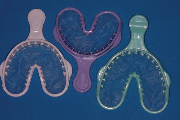 When an alginate impression is desired or required for the fabrication of bleaching trays, and the patient is concerned about having a gag response, one option is a closed-mouth impression. Similar to the closed-mouth quadrant impression trays for crowns, there are full-arch, closed-mouth impression trays for alginate. These "triple trays" come in the same three standard sizes as stock single-arch trays (Figure 15). When a patient has a strong gag reflex but is able to breathe through his or her nose, the impression can be made with the mouth closed. The technique involves preparing a three-scoop mixture of alginate, as would be done for a large maxillary impression, and loading both sides of the closed-mouth tray. Next, alginate is wiped on the occlusal surfaces of the teeth, and the loaded tray is inserted into the mouth on the mandibular arch first with the patient holding his or her tongue to the roof of the mouth. Immediately lift the lips while the patient bites into the maxillary portion of the impression material. Border mold the lips for both the maxillary and mandibular impressions. Once the alginate is set, remove it from the mouth, and rinse and disinfect.