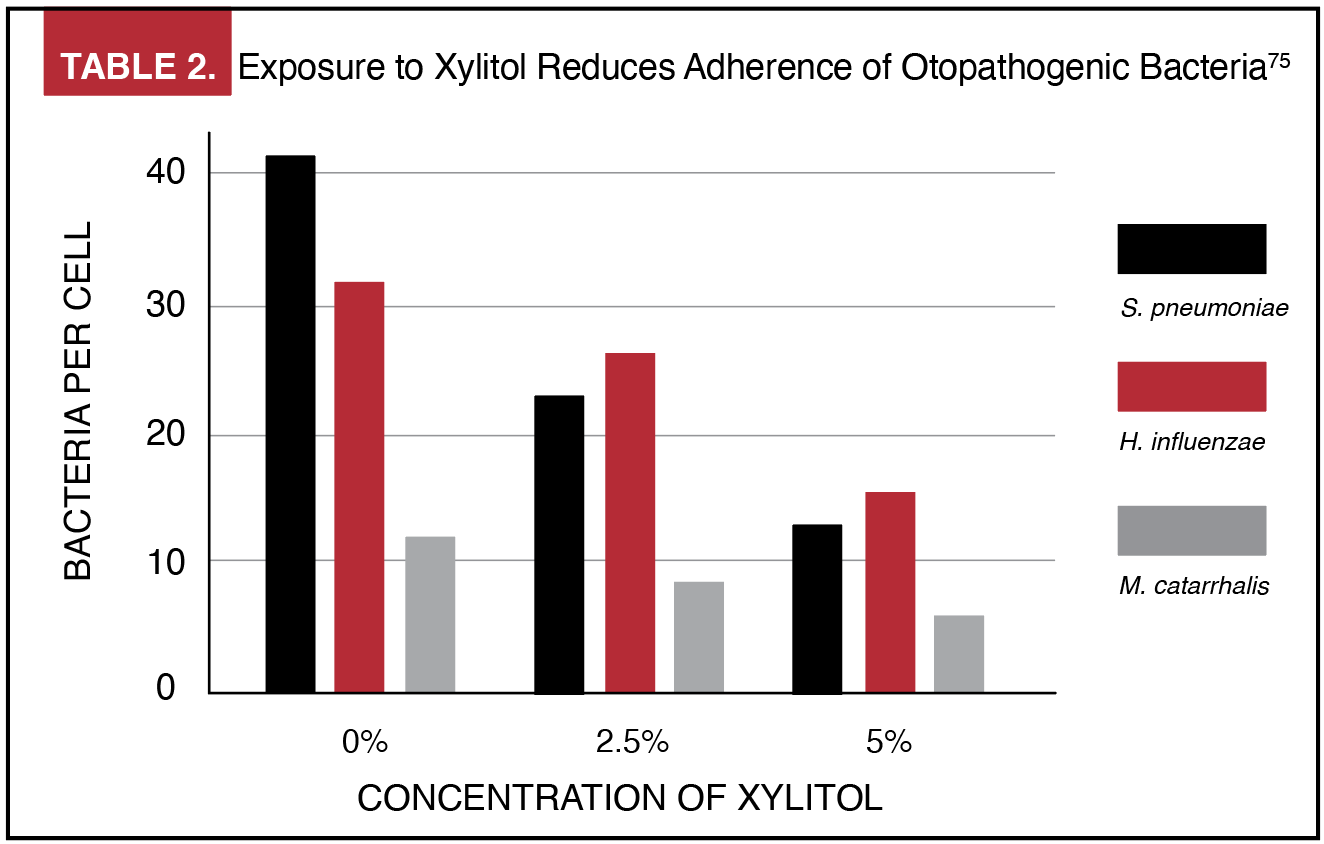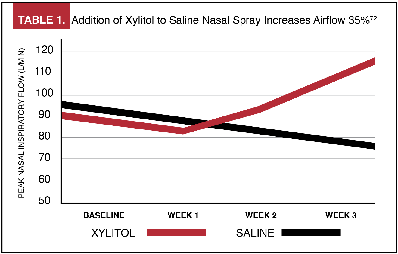 When xylitol is added to normal saline, it creates a hypertonic nasal spray that can draw excess fluid from edematous tissue, thereby opening the airway and facilitating nasal breathing (see Table 1).72 Xylitol/saline nasal spray also helps to moisturize, thin secretions, relieve congestion, and rinse away allergens and irritants.73 In addition, xylitol has anti-biofilm and anti-adhesive effects on upper airway pathogens (see Table 2).74,75 It is recommended to use a xylitol/saline nasal spray at least twice each day. This use can easily be linked with routine toothbrushing.
