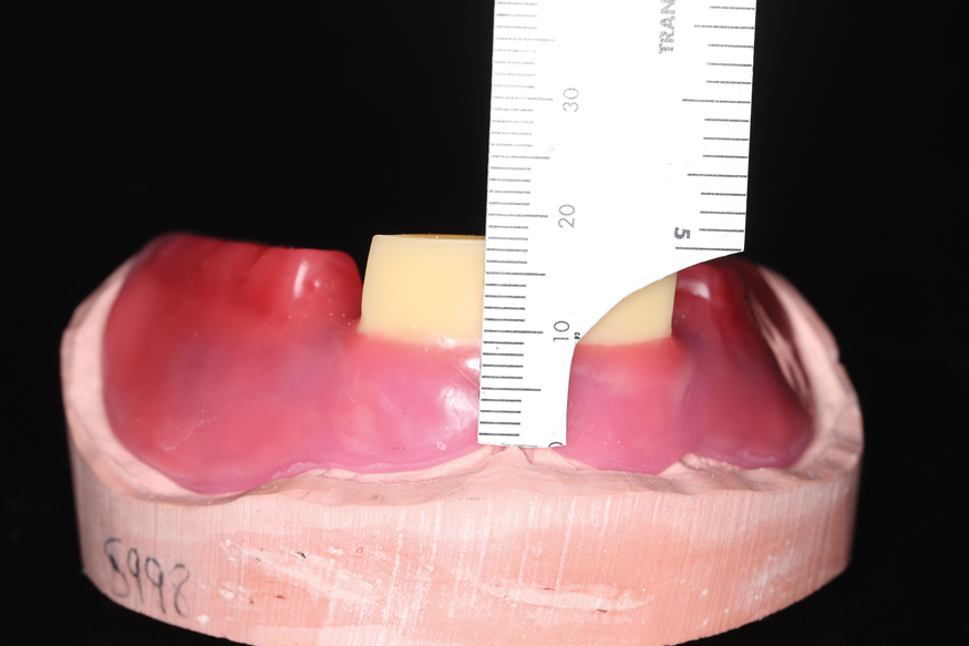 First, the maxillary cast is mounted on the articulator. Then the baseplates with the gothic arch record are placed on the edentulous casts, which allows the lower edentulous cast to be mounted on the articulator. The pin on the articulator is set to zero for reference. Once the mounting stone is set, the gothic arch record is removed, and the initial set of baseplates and wax rims that communicate incisal edge position are placed on the mounted edentulous casts. The pin on the articulator is then adjusted so that the speaking wax is just out of contact with the upper wax rim (Figure 11). This pin setting represents the appropriate vertical dimension of occlusion that has been determined for the patient.