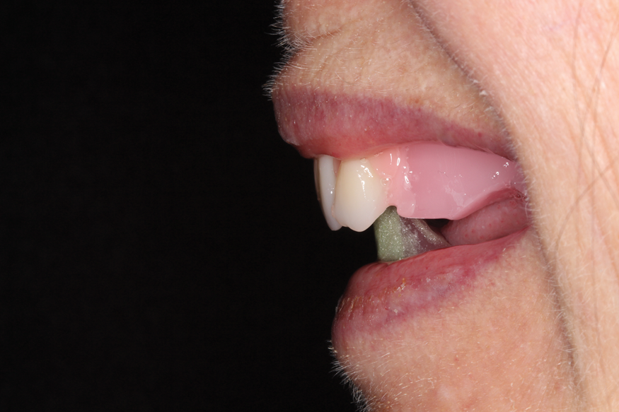 Another determinant of the vertical dimension of occlusion that is important to note is the amount of "posterior speaking space" available. This is the amount of space between the posterior teeth when the mandible moves forward to enunciate the "S" sound.8 As with the amount of forward movement of the mandible, the amount of space between the posterior teeth will vary depending on the patient's skeletal classification. A patient with a skeletal class 2 relationship will have more posterior speaking space than a patient with a skeletal class 1 relationship. If the posterior teeth are touching when the patient enunciates the "S" sounds, it is an indicator that the vertical dimension of occlusion is too great.