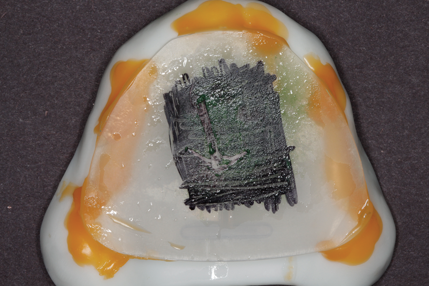 Next, the striking plate is covered with a permanent black marker, and the patient is asked to make the functional movements again to create the tracing. When the pin is located at the point where the three lines of the tracing intersect, the jaw is in centric relation (Figure 9). Using a bur, a dimple is created on the striking plate at the intersection of these lines. The patient is then instructed to retrude his or her mandible until the pin falls into the dimple, which holds the patient in the centric relation position. Once in position, an injectable bite registration material is used to index the upper and lower baseplates.