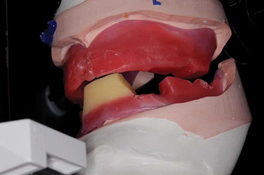 The baseplates and wax rims are used to transfer the correct orientation of the master casts to a semi-adjustable articulator by way of a facebow and the centric relation bite record.14 The posterior part of the maxillary rim is notched so that the bite registration material on the fork forms a solid index (Figure 10).