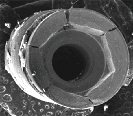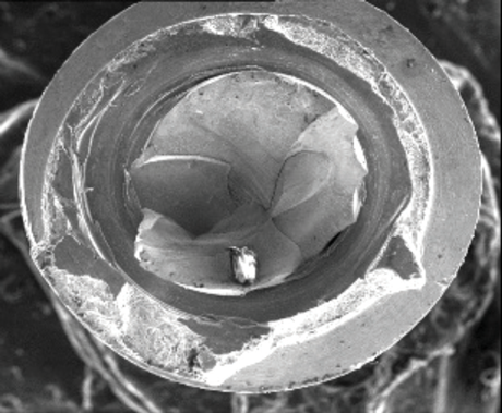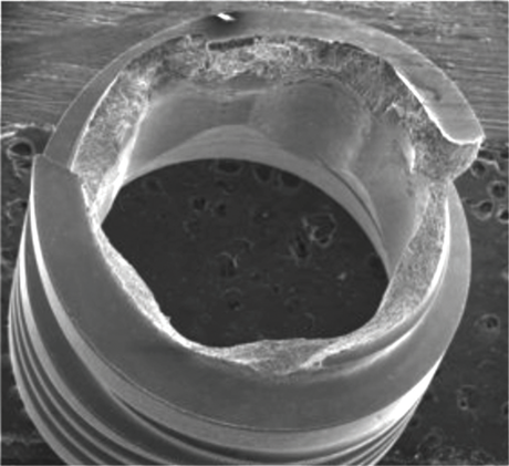 As discussed, yield strength defines the stress at which metal begins to plastically deform. When presented with off-axis loads over time, an external hex connection on an implant may undergo creep, which leads to rounding of the points because this is where the stress is concentrated. As the points on the external hex deform, they permit greater micromovement of the abutment, which leads to greater stress being placed on the abutment screw and can result in fracture of the screw (Figure 9). When an implant is fabricated from CP-Ti, even grade 4, there is a greater potential for this problem than if it is fabricated from titanium alloy grade 5; however, it occurs less frequently in wider diameter implants.