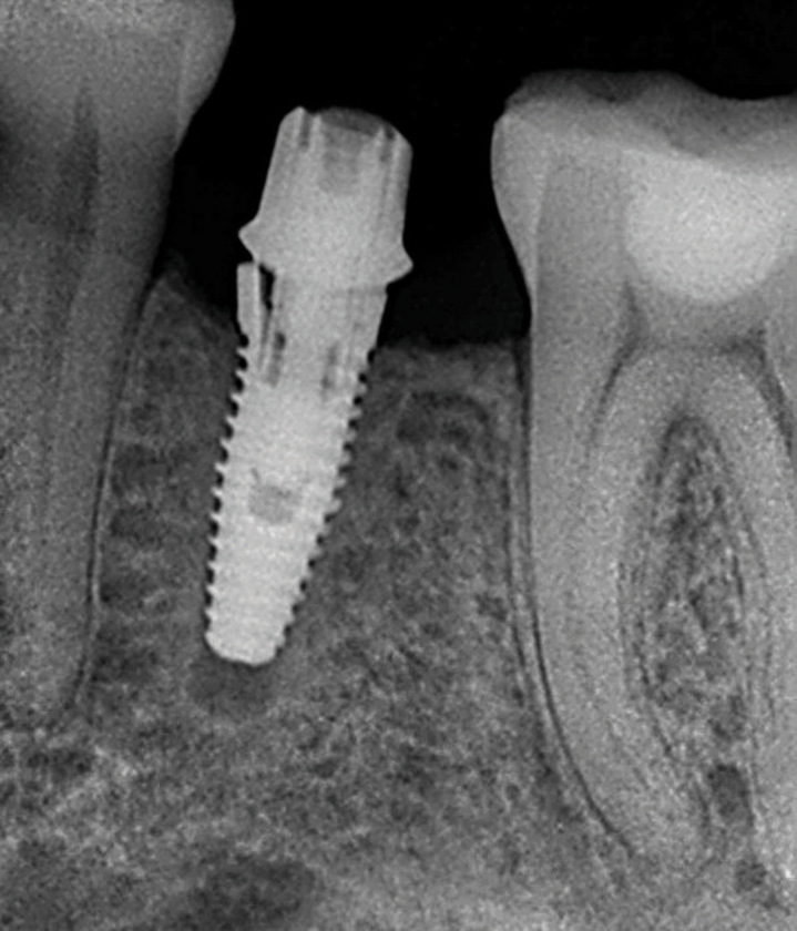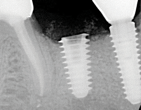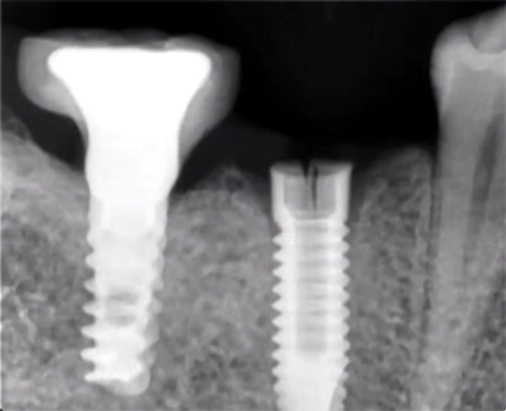 Implants with internal hex connections are more prone to failure at the connection than those with external hex connections.28 This is related to the thickness of the metal at the thinnest point between the internal surface of the interface and the external surface at the crestal area of the implant. When overloaded, implants with an internal hex connection may present with fractures at the points of the hex.29 These points are where the metal is the thinnest at the crestal portion of the implant and where stress is concentrated during overloading. This is less problematic in wider diameter implants because the metal is thicker in this area of the implant; however, in standard or narrow diameter implants, fracture may result, causing catastrophic failure of the implant (Figure 1). This may also occur in other internal implant connection types, such as trilobe connections, especially when the crestal thickness of the implant is minimal, leading to fracture of the coronal aspect of the implant (Figure 2). Implants with conical connections are not immune to potential fracture in this area, and the thin walls of some standard or narrow diameter models may split even without the isolated stress points observed in internal hex-, trilobe-, and octagon-type connections (Figure 3).30 Sometimes, fractures of implants at the coronal aspect are not clinically visible but, instead, are identified radiographically either after a patient complaint of pain in the area, due to the presence of soft-tissue inflammation, or during a routine examination with no patient complaint (Figure 4).