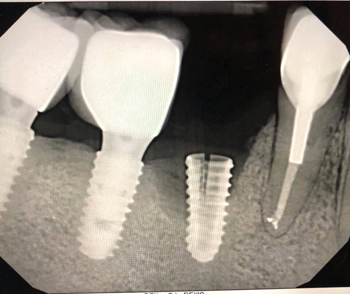 Coronal implant fracture, whether it is incomplete (Figure 5) or involves a visible loss of a portion of the implant platform (Figure 6 and Figure 7), results in catastrophic failure of the implant. The presence of any fracture in the coronal aspect of an implant necessitates explantation. These implants cannot be salvaged because an incomplete fracture will continue to propagate due to micromovement of the abutment and implant at the connection during function. Off-axis loads are amplified when there is a longer distance between the implant's platform and the most coronal surface of the restoration because the fulcrum arm is increased, allowing higher loading forces at the platform.31