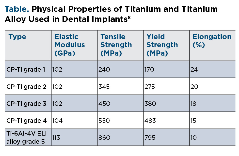 Today, dental implants are offered in both CP-Ti grade 4 and titanium alloy grade 5, depending on the specific manufacturer and design. With regard to osseointegration, no clinically significant differences have been reported between these two metal types. Implant selection should be based on the properties of the metal used in fabrication and its resistance to potential fracture in situations when mechanical overloading may occur during function. Unfortunately, when planning a case, it is frequently difficult to predict if a patient will exceed loading limits, and oftentimes, this isn't known until the implant is placed and a failure has actually occurred. Titanium alloy grade 5 provides greater strength than CP-Ti grade 4, and the selection of implants fabricated from this metal over those implants made of CP-Ti should be considered a clinical improvement. This choice can help to eliminate the potential for failures related to the metal that implants are fabricated from.