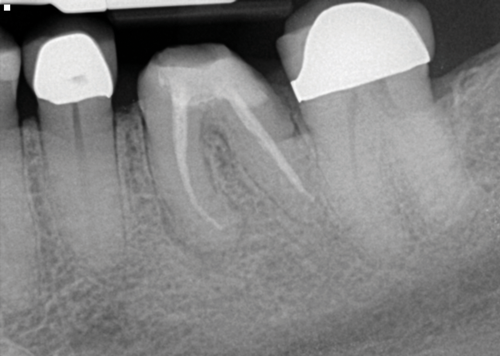 The idea that a dentist may be incorrect in his or her diagnosis is distasteful, but a reality that this profession wrestles with on a daily basis. An image comparison can help to clarify this thought. The first image is a 2D radiograph of tooth No. 19 that includes the buccal cortical plate the lingual cortical plate and approximately 10 mm of trabecular bone compressed into a single image (Figure 1). Because the full width and volume of the tooth is included in the image, any existing pathoses could be masked or hidden in a fog of digital information. A CBCT scan of the same tooth provides more detail because it can present a slice (0.1 mm) of information from the center of the area in question (Figure 2). All of the extraneous information is eliminated, and the clinician and the patient have a more precise picture to evaluate. Furthermore, a periapical radiograph can be distorted by the angle of the cone to the sensor, whereas a CBCT scan has no distortion and is accurate in all views. With a CBCT scan, the clinician is able to state with certainty that a condition exists, and the patient is able to more clearly understand what his or her condition is when considering the available choices for treatment.