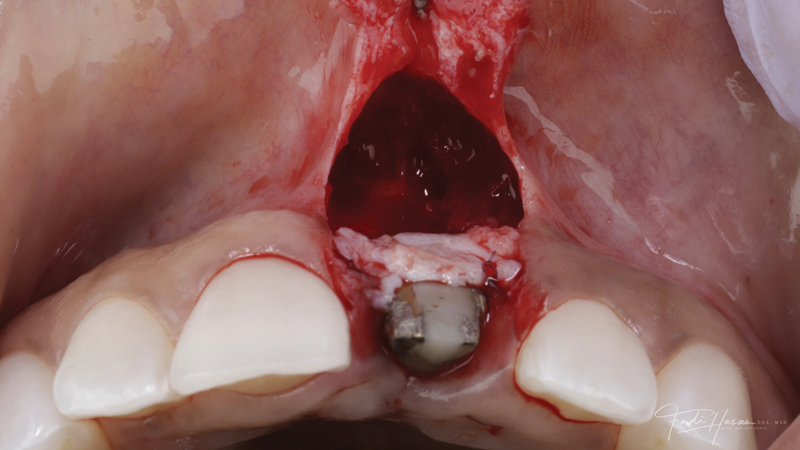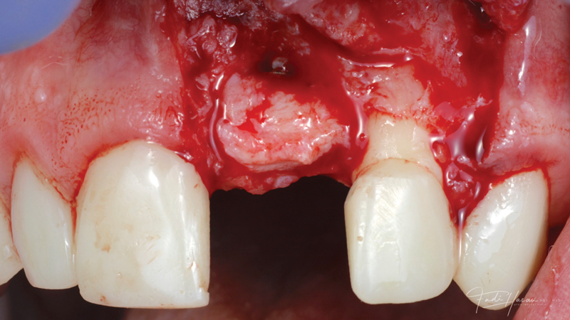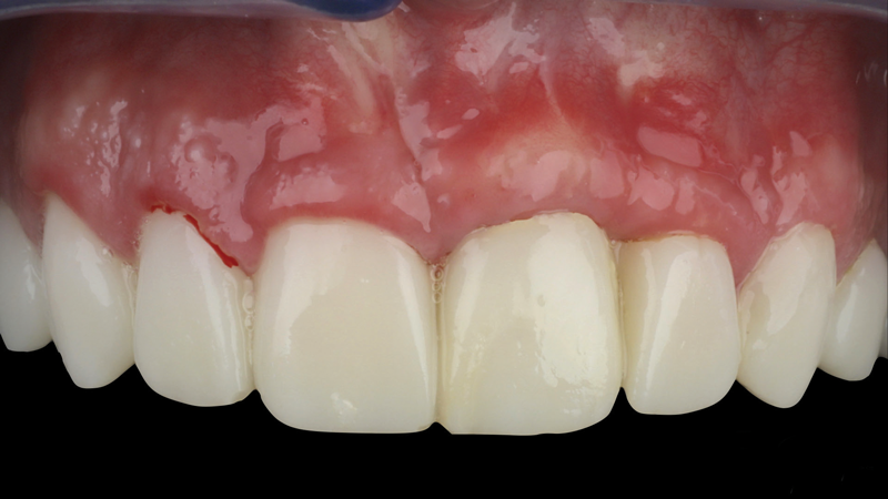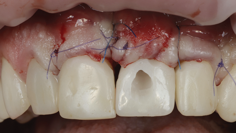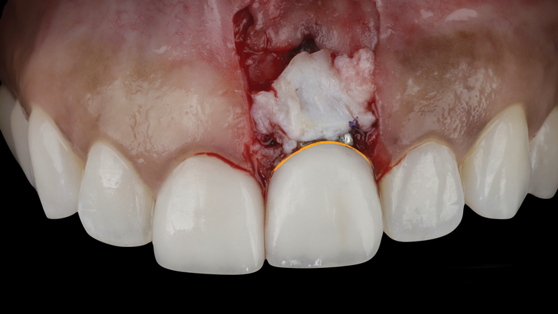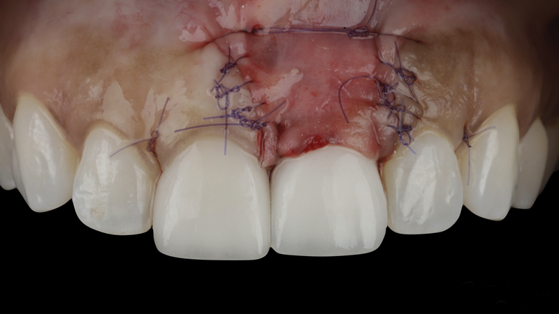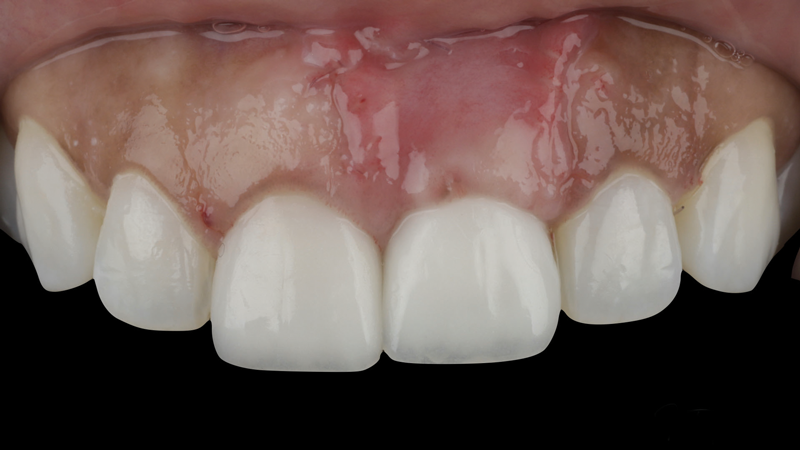 A patient presented for the restoration of an implant that had been placed at the site of tooth No. 9, which exhibited a residual soft-tissue deficiency and an undulating facial soft-tissue morphology (Figure 11). The objective of the treatment was to change the appearance and thickness of the facial soft tissue prior to crown placement to optimize the esthetics and prevent future soft-tissue dehiscence. After flap reflection (Figure 12), a graft was acquired from the patient's tuberosity to augment the supracrestal soft tissue (Figure 13). A volume-stable collagen matrix was then placed to further increase the thickness of the soft tissue adjacent to the implant body (Figure 14), and the flap was sutured closed (Figure 15). Following a 3-month healing period, a positive change in the soft tissue's morphology was apparent; however, its volume remained deficient when compared with that of tooth No. 8 (Figure 16). When the screw-retained crown was delivered, a second graft was acquired from the tuberosity and placed to further increase the volume of the supracrestal soft tissue (Figure 17 and Figure 18). A postoperative healing period of 4 months resulted in an ideal position of the margin of tooth No. 9 with regard to its contralateral counterpart as well as more natural looking soft-tissue morphology and excellent supracrestal soft-tissue thickness (Figure 19 and Figure 20). Eight months postoperatively, the position of the gingival margin and the thickness of the soft tissue had been maintained (Figure 21 and Figure 22).